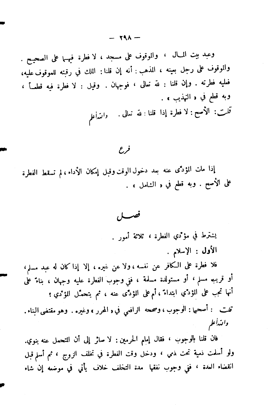 وَالْمَوْقُوفُ عَلَى رَجُلٍ بِعَيْنِهِ، الْمَذْهَبُ: أَنَّهُ إِنْ قُلْنَا: الْمِلْكُ فِي رَقَبَتِهِ لِلْمَوْقُوفِ عَلَيْهِ، فَعَلَيْهِ فِطْرَتُهُ. وَإِنْ قُلْنَا: لِلَّهِ تَعَالَى، فَوَجْهَانِ. وَقِيلَ: لَا فِطْرَةَ فِيهِ قَطْعًا، وَبِهِ قُطِعَ فِي «التَّهْذِيبِ» .