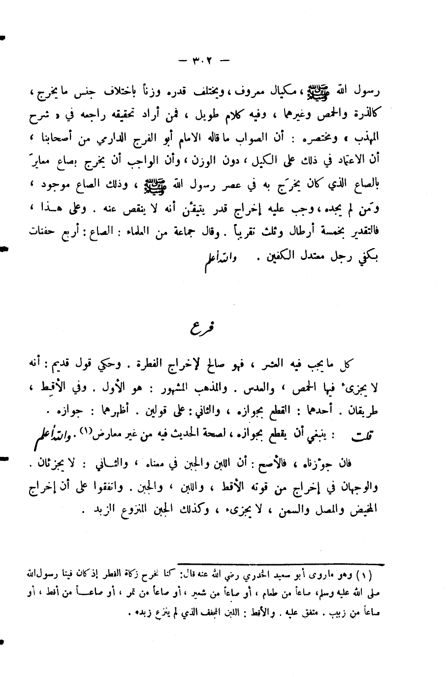 رَسُولِ اللَّهِ - صَلَّى اللَّهُ عَلَيْهِ وَسَلَّمَ -، مِكْيَالٌ مَعْرُوفٌ، وَيَخْتَلِفُ قَدْرُهُ وَزْنًا بِاخْتِلَافِ جِنْسِ مَا يَخْرُجُ، كَالذُّرَةِ وَالْحِمَّصِ وَغَيْرِهِمَا، وَفِيهِ كَلَامٌ طَوِيلٌ، فَمَنْ أَرَادَ تَحْقِيقَهُ رَاجَعَهُ فِي «شَرْحِ الْمُهَذَّبِ» وَمُخْتَصَرِهُ: أَنَّ الصَّوَابَ مَا قَالَهُ الْإِمَامُ أَبُو الْفَرَجِ الدَّارِمِيُّ مِنْ أَصْحَابِنَا، أَنَّ الِاعْتِمَادَ فِي ذَلِكَ عَلَى الْكَيْلِ، دُونَ الْوَزْنِ، وَأَنَّ الْوَاجِبَ أَنْ يُخْرَجَ بِصَاعٍ مُعَايَرٍ بِالصَّاعِ الَّذِي كَانَ يُخْرَجُ بِهِ فِي عَصْرِ رَسُولِ اللَّهِ - صَلَّى اللَّهُ عَلَيْهِ وَسَلَّمَ -، وَذَلِكَ الصَّاعُ مَوْجُودٌ، وَمَنْ لَمْ يَجِدْهُ، وَجَبَ عَلَيْهِ إِخْرَاجُ قَدْرٍ يَتَيَقَّنُ أَنَّهُ لَا يَنْقُصُ عَنْهُ. وَعَلَى هَذَا، فَالتَّقْدِيرُ بِخَمْسَةِ أَرْطَالٍ وَثُلُثٍ تَقْرِيبًا. وَقَالَ جَمَاعَةٌ مِنَ الْعُلَمَاءِ: الصَّاعُ: أَرْبَعُ حَفَنَاتٍ بِكَفَّيْ رَجُلٍ مُعْتَدِلِ الْكَفَّيْنِ. وَاللَّهُ أَعْلَمُ.