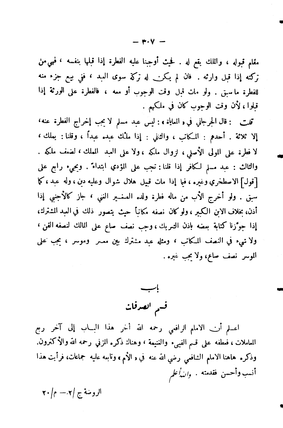 قُلْتُ: قَالَ الْجُرْجَانِيُّ فِي «الْمُعَايَاةِ» : لَيْسَ عَبْدٌ مُسْلِمٌ لَا يَجِبُ إِخْرَاجُ الْفِطْرَةِ، إِلَّا ثَلَاثَةً. أَحَدُهُمُ: الْمُكَاتَبُ، وَالثَّانِي: إِذَا مَلَّكَ عَبْدَهُ عَبْدًا، وَقُلْنَا: يَمْلِكُ، لَا فِطْرَةَ عَلَى الْمَوْلَى الْأَصْلِيِّ، لِزَوَالِ مِلْكِهِ، وَلَا عَلَى الْعَبْدِ الْمُمَلَّكِ، لِضَعْفِ مِلْكِهِ وَالثَّالِثُ: عَبْدٌ مُسْلِمٌ لِكَافِرٍ إِذَا قُلْنَا: تَجِبُ عَلَى الْمُؤَدِّي ابْتِدَاءً.