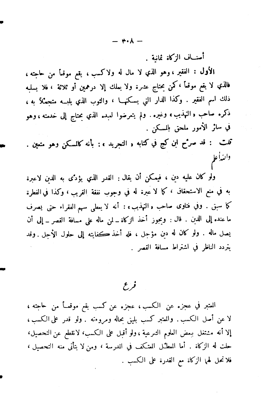 الْأَوَّلُ: الْفَقِيرُ، وَهُوَ الَّذِي لَا مَالَ لَهُ وَلَا كَسْبَ، يَقَعُ مَوْقِعًا مِنْ حَاجَتِهِ، فَالَّذِي لَا يَقَعُ مَوْقِعًا، كَمَنْ يَحْتَاجُ عَشَرَةً وَلَا يَمْلِكُ إِلَّا دِرْهَمَيْنِ أَوْ ثَلَاثَةً، فَلَا يَسْلُبُهُ ذَلِكَ اسْمَ الْفَقِيرِ.