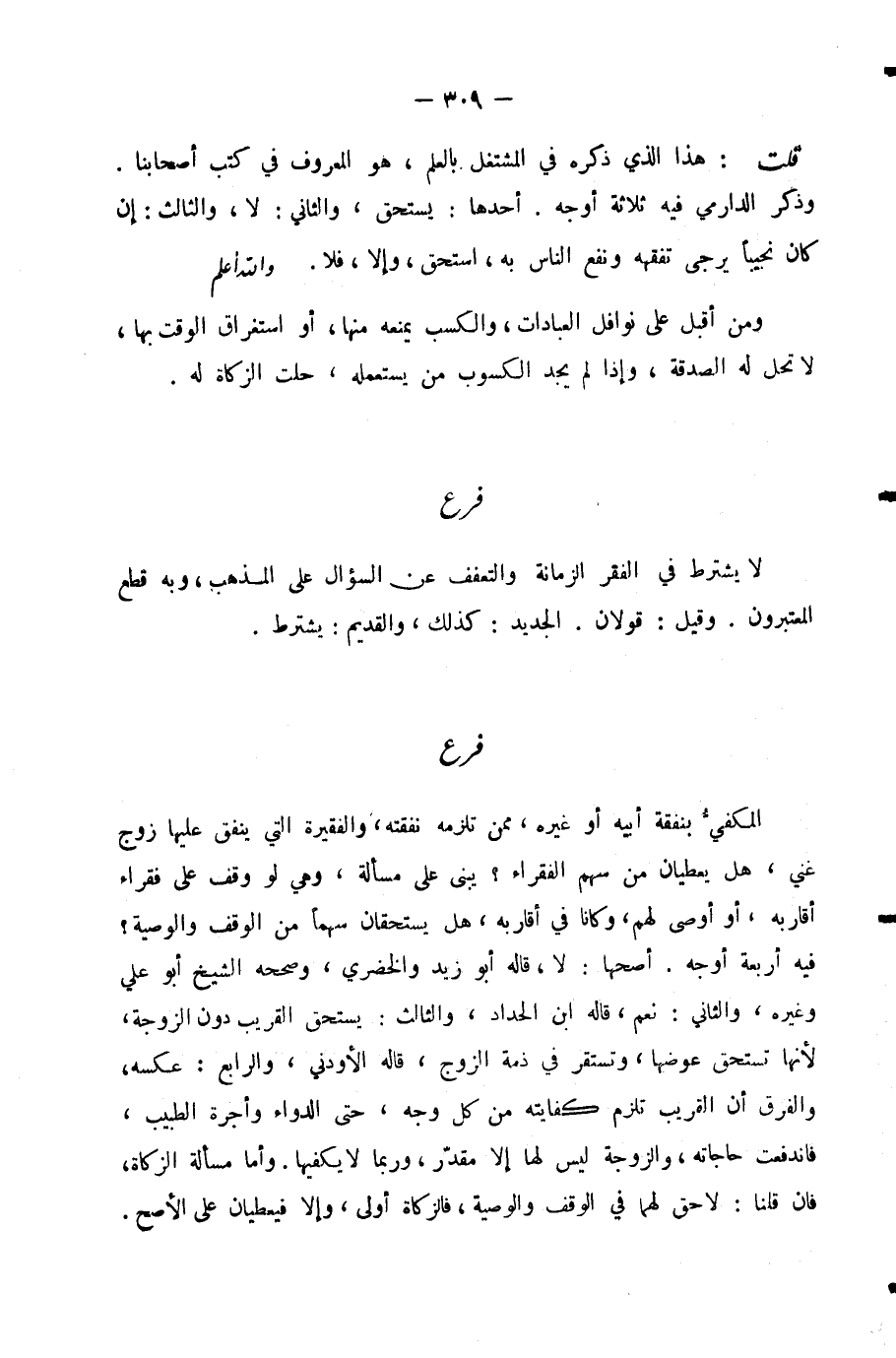 قُلْتُ: هَذَا الَّذِي ذَكَرَهُ فِي الْمُشْتَغِلِ بِالْعِلْمِ، هُوَ الْمَعْرُوفُ فِي كُتُبِ أَصْحَابِنَا. وَذَكَرَ الدَّارِمِيُّ فِيهِ ثَلَاثَةَ أَوْجُهٍ. أَحَدُهَا: يَسْتَحِقُّ، وَالثَّانِي: لَا، وَالثَّالِثُ: إِنْ كَانَ نَجِيبًا يُرْجَى تَفَقُّهُهُ وَنَفْعُ النَّاسِ بِهِ، اسْتَحَقَّ، وَإِلَّا، فَلَا. وَاللَّهُ أَعْلَمُ.