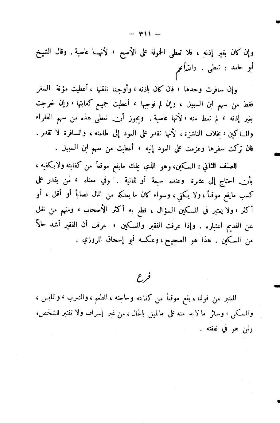 وَإِنْ سَافَرَتْ وَحْدَهَا، فَإِنْ كَانَ بِإِذْنِهِ، وَأَوْجَبْنَا نَفَقَتَهَا، أُعْطِيَتْ مُؤْنَةَ السَّفَرِ فَقَطْ مِنْ سَهْمِ ابْنِ السَّبِيلِ، وَإِنْ لَمْ نُوجِبْهَا، أُعْطِيَتْ جَمِيعَ كِفَايَتِهَا، وَإِنْ خَرَجَتْ بِغَيْرِ إِذْنِهِ، لَمْ تُعْطَ مِنْهُ، لِأَنَّهَا عَاصِيَةٌ. وَيَجُوزُ أَنْ تُعْطَى هَذِهِ مِنْ سَهْمِ الْفُقَرَاءِ وَالْمَسَاكِينِ، بِخِلَافِ النَّاشِزَةِ، لِأَنَّهَا تَقْدِرُ عَلَى الْعَوْدِ إِلَى طَاعَتِهِ، وَالْمُسَافِرَةُ لَا تَقْدِرُ. فَإِنْ تَرَكَتْ سَفَرَهَا وَعَزَمَتْ عَلَى الْعَوْدِ إِلَيْهِ، أُعْطِيَتْ مِنْ سَهْمِ ابْنِ السَّبِيلِ.