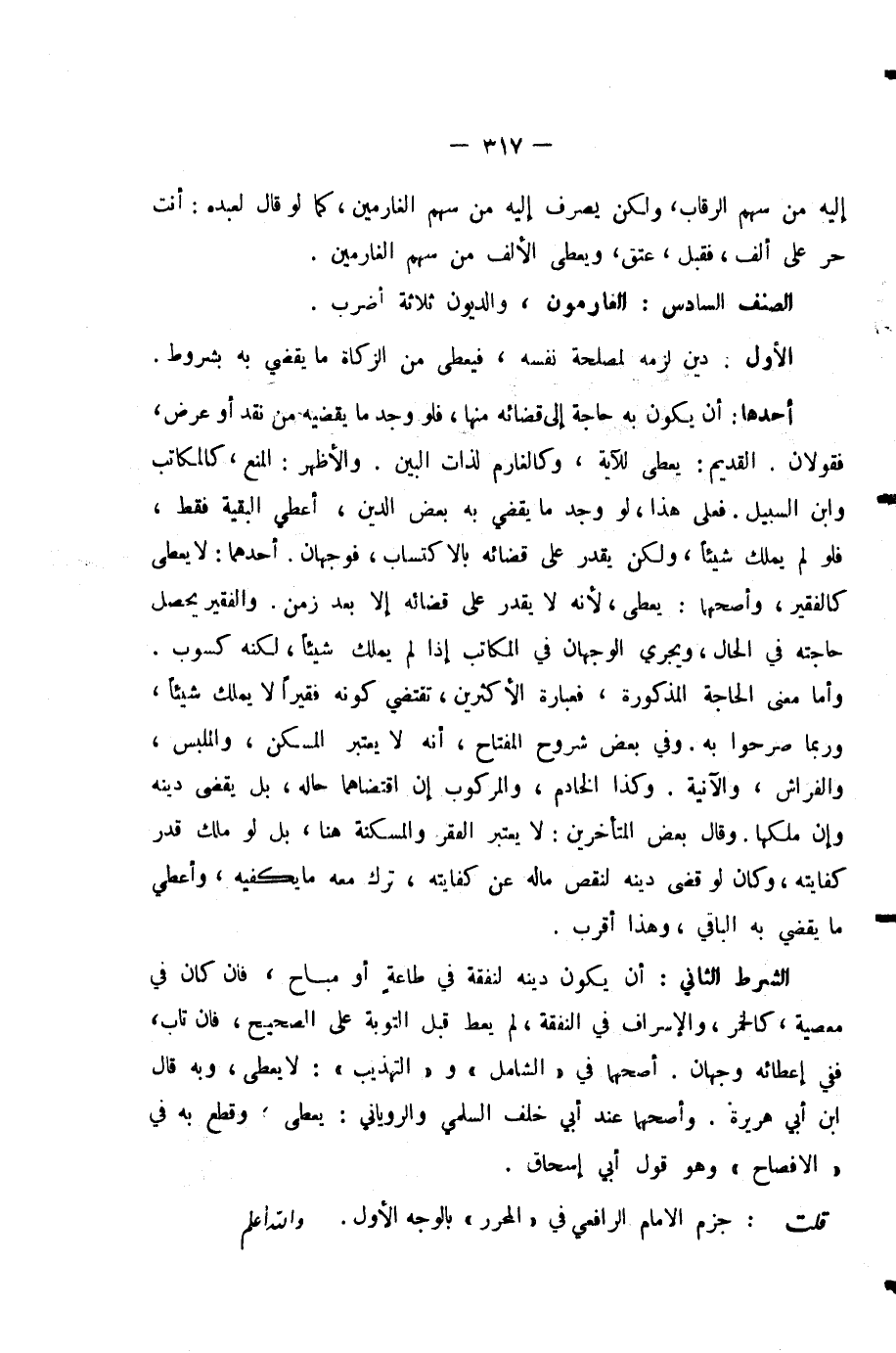 وَقَالَ بَعْضُ الْمُتَأَخِّرِينَ: لَا يُعْتَبَرُ الْفَقْرُ وَالْمَسْكَنَةُ هُنَا، بَلْ لَوْ مَلَكَ قَدْرَ كِفَايَتِهِ، وَكَانَ لَوْ قَضَى دَيْنَهُ لَنَقَصَ مَالُهُ عَنْ كِفَايَتِهِ، تُرِكَ مَعَهُ مَا يَكْفِيهِ، وَأُعْطِيَ مَا يَقْضِي بِهِ الْبَاقِيَ، وَهَذَا أَقْرَبُ.