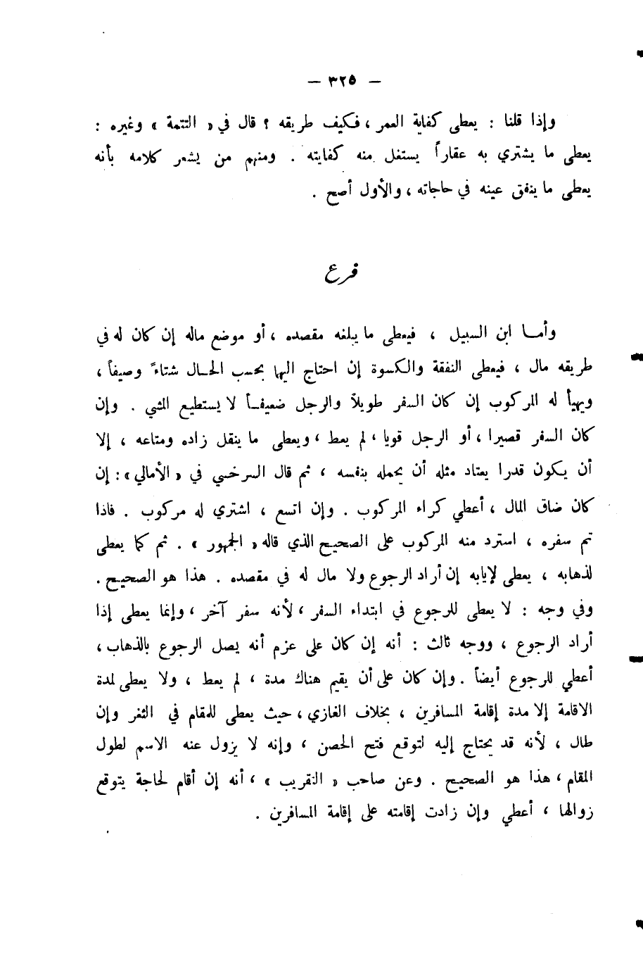 وَأَمَّا ابْنُ السَّبِيلِ، فَيُعْطَى مَا يُبْلِغُهُ مَقْصِدَهُ، أَوْ مَوْضِعَ مَالِهِ إِنْ كَانَ لَهُ فِي طَرِيقِهِ مَالٌ، فَيُعْطَى النَّفَقَةَ وَالْكُسْوَةَ إِنِ احْتَاجَ إِلَيْهِمَا بِحَسَبِ الْحَالِ شِتَاءً وَصَيْفًا، وَيُهَيَّأُ لَهُ الْمَرْكُوبُ إِنْ كَانَ السَّفَرُ طَوِيلًا وَالرَّجُلُ ضَعِيفًا لَا يَسْتَطِيعُ الْمَشْيَ.
