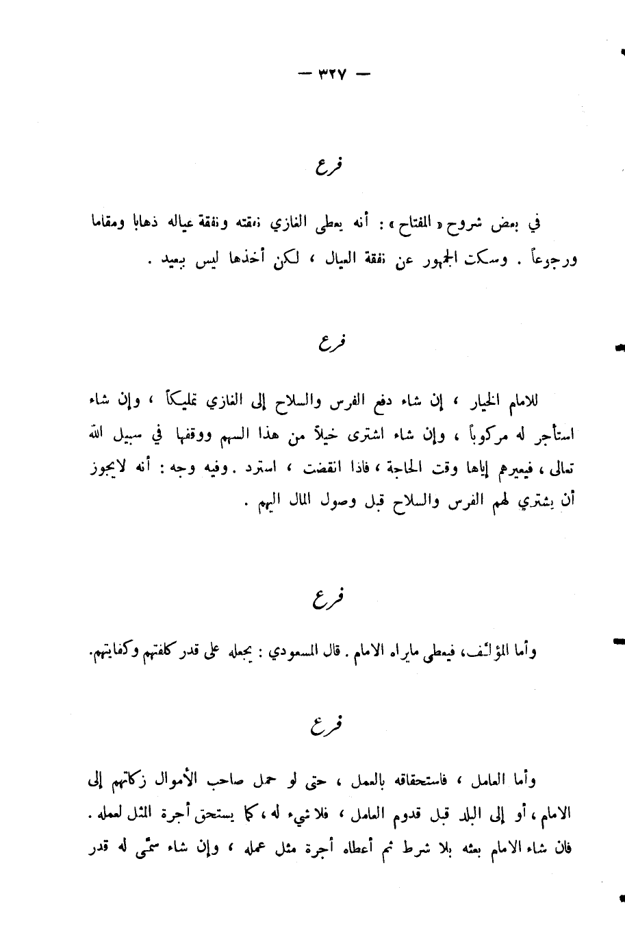 فِي بَعْضِ شُرُوحِ «الْمِفْتَاحِ» : أَنَّهُ يُعْطَى الْغَازِي نَفَقَتَهُ وَنَفَقَةَ عِيَالِهِ ذَهَابًا وَمَقَامًا وَرُجُوعًا. وَسَكَتَ الْجُمْهُورُ عَنْ نَفَقَةِ الْعِيَالِ، لَكِنَّ أَخْذَهَا لَيْسَ بِبَعِيدٍ.