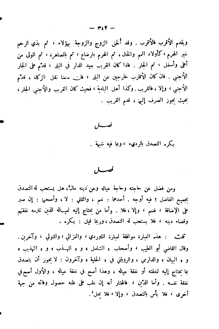 وَقَالَ الْقَاضِي أَبُو الطَّيِّبِ، وَأَصْحَابُ «الشَّامِلِ» وَ «الْمُهَذَّبِ» وَ «التَّهْذِيبِ» وَ «الْبَيَانِ» وَالدَّارِمِيُّ، وَالرُّويَانِيُّ فِي «الْحِلْيَةِ» وَآخَرُونَ: لَا يَجُوزُ أَنْ يَتَصَدَّقَ بِمَا يَحْتَاجُ إِلَيْهِ لِنَفَقَتِهِ أَوْ نَفَقَةِ عِيَالِهِ، وَهَذَا أَصَحُّ فِي نَفَقَةِ عِيَالِهِ، وَالْأَوَّلُ أَصَحُّ فِي نَفَقَةِ نَفْسِهِ، وَأَمَّا الدَّيْنُ، فَالْمُخْتَارُ أَنَّهُ إِنْ غَلَبَ عَلَى ظَنِّهِ حُصُولُ وَفَائِهِ مِنْ جِهَةٍ أُخْرَى، فَلَا بَأْسَ بِالتَّصَدُّقِ، وَإِلَّا، فَلَا يَحِلُّ.