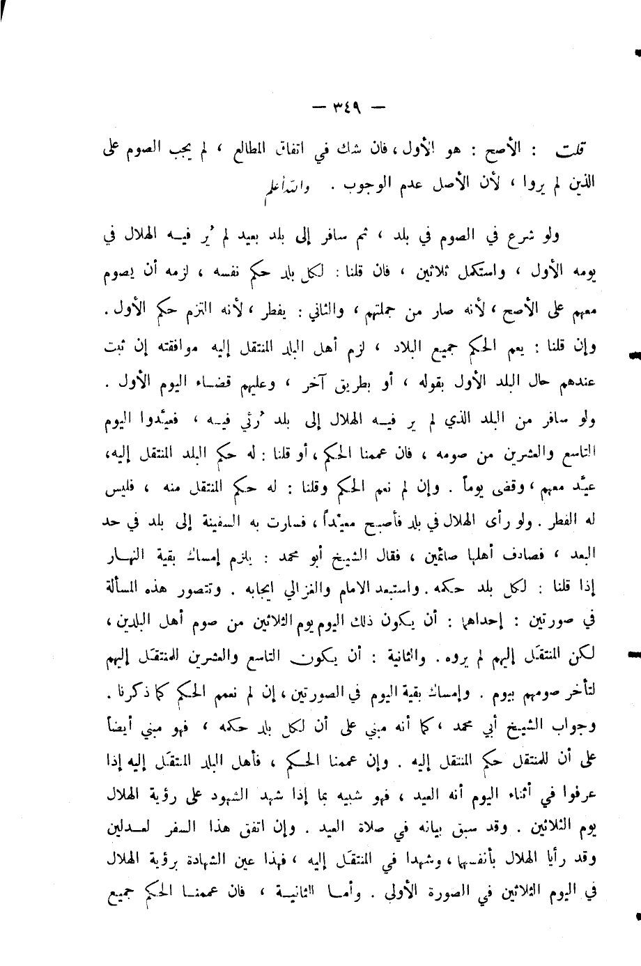 وَجَوَابُ الشَّيْخِ أَبِي مُحَمَّدٍ، كَمَا أَنَّهُ مَبْنِيٌّ عَلَى أَنَّ لِكُلِّ بَلَدٍ حُكْمَهُ، فَهُوَ مَبْنِيٌّ أَيْضًا عَلَى أَنَّ لِلْمُنْتَقِلِ حُكْمَ الْمُنْتَقَلِ إِلَيْهِ. وَإِنْ عِمَّمْنَا الْحُكْمَ، فَأَهْلُ الْبَلَدِ الْمُنْتَقَلِ إِلَيْهِ إِذَا عَرَفُوا فِي أَثْنَاءِ الْيَوْمِ أَنَّهُ الْعِيدُ، فَهُوَ شَبِيهٌ بِمَا إِذَا شَهِدَ الشُّهُودُ عَلَى رُؤْيَةِ الْهِلَالِ يَوْمَ الثَّلَاثِينَ.