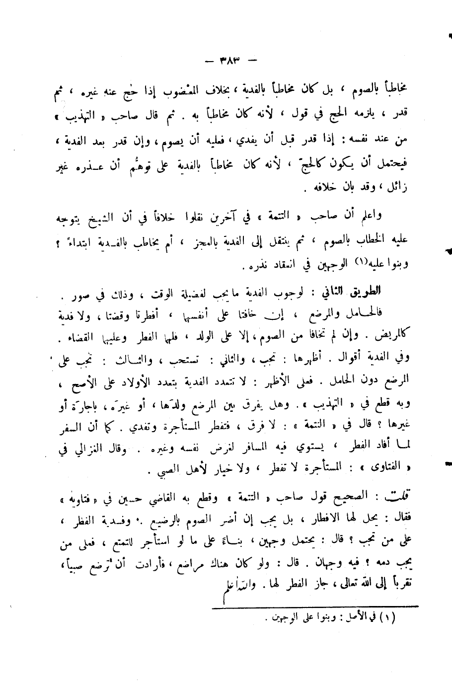 وَاعْلَمْ أَنَّ صَاحِبَ «التَّتِمَّةِ» فِي آخَرِينَ نَقَلُوا خِلَافًا فِي أَنَّ الشَّيْخَ يَتَوَجَّهُ عَلَيْهِ الْخِطَابُ بِالصَّوْمِ، ثُمَّ يَنْتَقِلُ إِلَى الْفِدْيَةِ بِالْعَجْزِ، أَمْ يُخَاطَبُ بِالْفِدْيَةِ ابْتِدَاءً؟ وَبَنَوْا عَلَيْهِ الْوَجْهَيْنِ فِي انْعِقَادِ نَذْرِهِ.