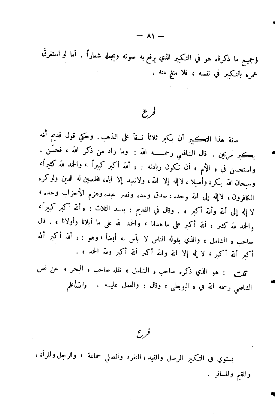 صِفَةُ هَذَا التَّكْبِيرِ أَنْ يُكَبِّرَ ثَلَاثًا نَسَقًا عَلَى الْمَذْهَبِ. وَحُكِيَ قَوْلٌ قَدِيمٌ أَنَّهُ يُكَبِّرُ مَرَّتَيْنِ. قَالَ الشَّافِعِيُّ - رَحِمَهُ اللَّهُ -: وَمَا زَادَ مِنْ ذِكْرِ اللَّهِ، فَحَسَنٌ. وَاسْتَحْسَنَ فِي (الْأُمِّ) أَنْ تَكُونَ زِيَادَتُهُ: (اللَّهُ أَكْبَرُ كَبِيرًا، وَالْحَمْدُ لِلَّهِ كَثِيرًا، وَسُبْحَانَ اللَّهِ بُكْرَةً وَأَصِيلًا، لَا إِلَهَ إِلَّا اللَّهُ، وَلَا نَعْبُدُ إِلَّا إِيَّاهُ، مُخْلِصِينَ لَهُ الدِّينَ وَلَوْ كَرِهَ الْكَافِرُونَ، لَا إِلَهَ إِلَّا اللَّهُ وَحْدَهُ، صَدَقَ وَعْدَهُ وَنَصَرَ عَبْدَهُ وَهَزَمَ الْأَحْزَابَ وَحْدَهُ، لَا إِلَهَ إِلَّا اللَّهُ وَاللَّهُ أَكْبَرُ) . وَقَالَ فِي الْقَدِيمِ: بَعْدَ الثَّلَاثِ: (اللَّهُ أَكْبَرُ كَبِيرًا، وَالْحَمْدُ لِلَّهِ كَثِيرًا، اللَّهُ أَكْبَرُ عَلَى مَا هَدَانَا، وَالْحَمْدُ لِلَّهِ عَلَى مَا أَبْلَانَا وَأَوْلَانَا) . قَالَ صَاحِبُ (الشَّامِلِ) وَالَّذِي يَقُولُهُ النَّاسُ لَا بَأْسَ بِهِ أَيْضًا، وَهُوَ: (اللَّهُ أَكْبَرُ اللَّهُ أَكْبَرُ اللَّهُ أَكْبَرُ، لَا إِلَهَ إِلَّا اللَّهُ وَاللَّهُ أَكْبَرُ اللَّهُ أَكْبَرُ وَلِلَّهِ الْحَمْدُ) .