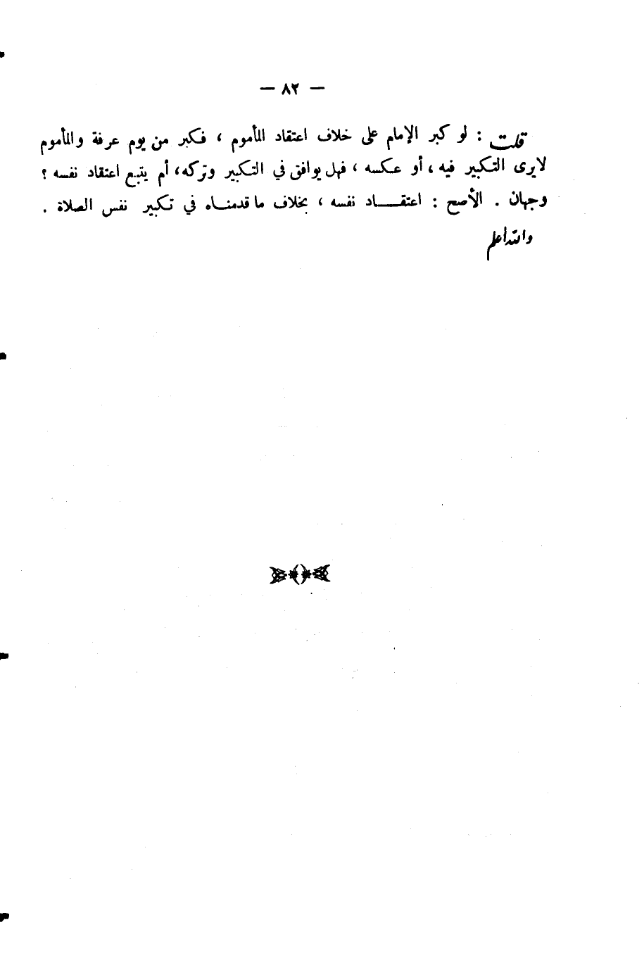 قُلْتُ: لَوْ كَبَّرَ الْإِمَامُ عَلَى خِلَافِ اعْتِقَادِ الْمَأْمُومِ، فَكَبَّرَ مِنْ يَوْمِ عَرَفَةَ وَالْمَأْمُومُ لَا يَرَى التَّكْبِيرَ فِيهِ، أَوْ عَكْسَهُ، فَهَلْ يُوَافِقُ فِي التَّكْبِيرِ وَتَرْكِهِ، أَمْ يَتَّبِعُ اعْتِقَادَ نَفْسِهِ؟ وَجْهَانِ. الْأَصَحُّ: اعْتِقَادُ نَفْسِهِ، بِخِلَافِ مَا قَدَّمْنَاهُ فِي تَكْبِيرِ نَفْسِ الصَّلَاةِ. - وَاللَّهُ أَعْلَمُ -.