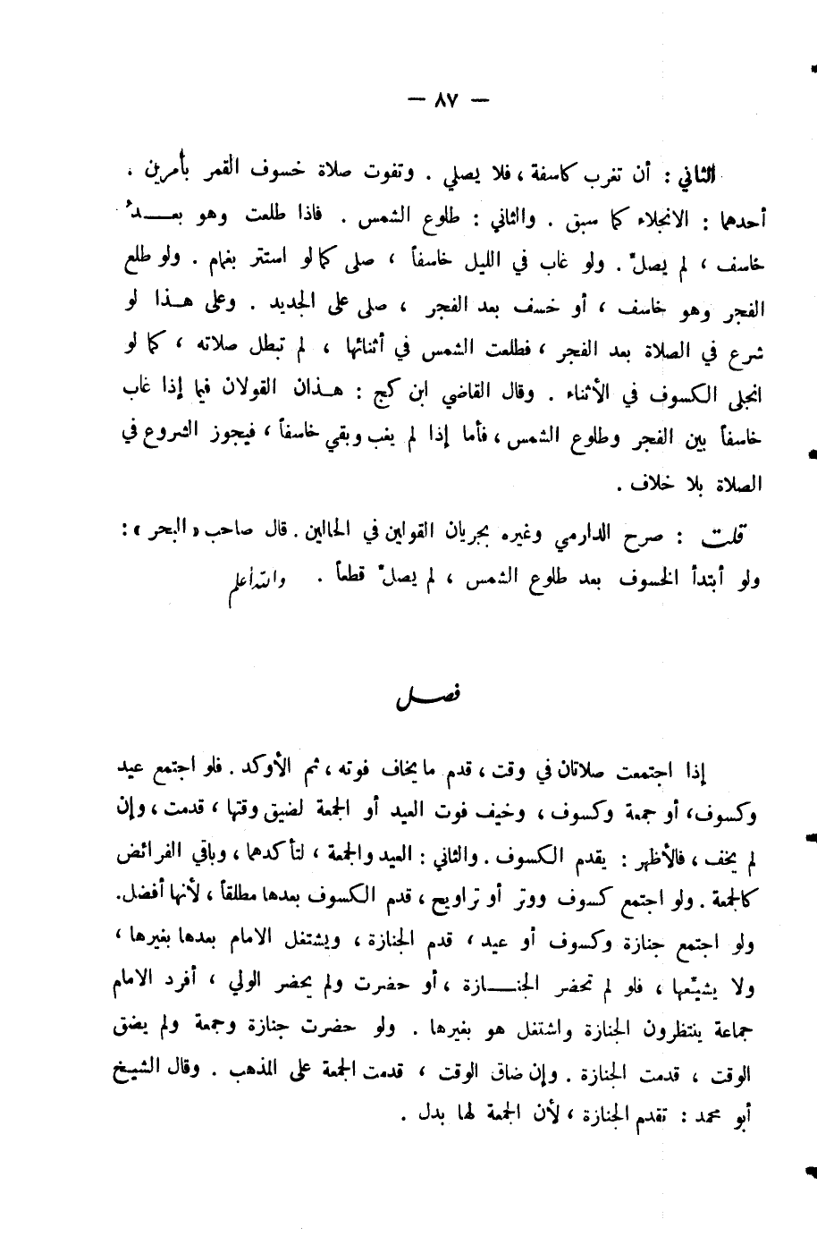 إِذَا اجْتَمَعَتْ صَلَاتَانِ فِي وَقْتٍ، قُدِّمَ مَا يُخَافُ فَوْتُهُ، ثُمَّ الْأَوْكَدُ. فَلَوِ اجْتَمَعَ عِيدٌ وَكُسُوفٌ، أَوْ جُمُعَةٌ وَكُسُوفٌ، وَخِيفَ فَوْتُ الْعِيدِ أَوِ الْجُمُعَةِ لِضِيقِ وَقْتِهَا، قُدِّمَتْ، وَإِنْ لَمْ يُخَفْ، فَالْأَظْهَرُ: يُقَدَّمُ الْكُسُوفُ. وَالثَّانِي: الْعِيدُ وَالْجُمُعَةُ، لِتَأَكُّدِهِمَا، وَبَاقِي الْفَرَائِضِ كَالْجُمُعَةِ. وَلَوِ اجْتَمَعَ كُسُوفٌ وَوِتْرٌ أَوْ تَرَاوِيحُ، قُدِّمَ الْكُسُوفُ مُطْلَقًا، لِأَنَّهَا أَفْضَلُ. وَلَوِ اجْتَمَعَ جِنَازَةٌ وَكُسُوفٌ أَوْ عِيدٌ، قَدَّمَ الْجِنَازَةَ، وَيَشْتَغِلُ الْإِمَامُ بَعْدَهَا بِغَيْرِهَا، وَلَا يُشَيِّعُهَا، فَلَوْ لَمْ تَحْضُرِ الْجِنَازَةُ، أَوْ حَضَرَتْ وَلَمْ يَحْضُرِ الْوَلِيُّ، أَفْرَدَ الْإِمَامُ جَمَاعَةً يَنْتَظِرُونَ الْجِنَازَةَ وَاشْتَغَلَ هُوَ بِغَيْرِهَا. وَلَوْ حَضَرَتْ جِنَازَةٌ وَجُمُعَةٌ وَلَمْ يَضِقِ الْوَقْتُ، قُدِّمَتِ الْجِنَازَةُ. وَإِنْ ضَاقَ الْوَقْتُ، قُدِّمَتِ الْجُمُعَةُ عَلَى الْمَذْهَبِ. وَقَالَ الشَّيْخُ أَبُو مُحَمَّدٍ: تُقَدَّمُ الْجِنَازَةُ، لِأَنَّ الْجُمُعَةَ لَهَا بَدَلٌ.