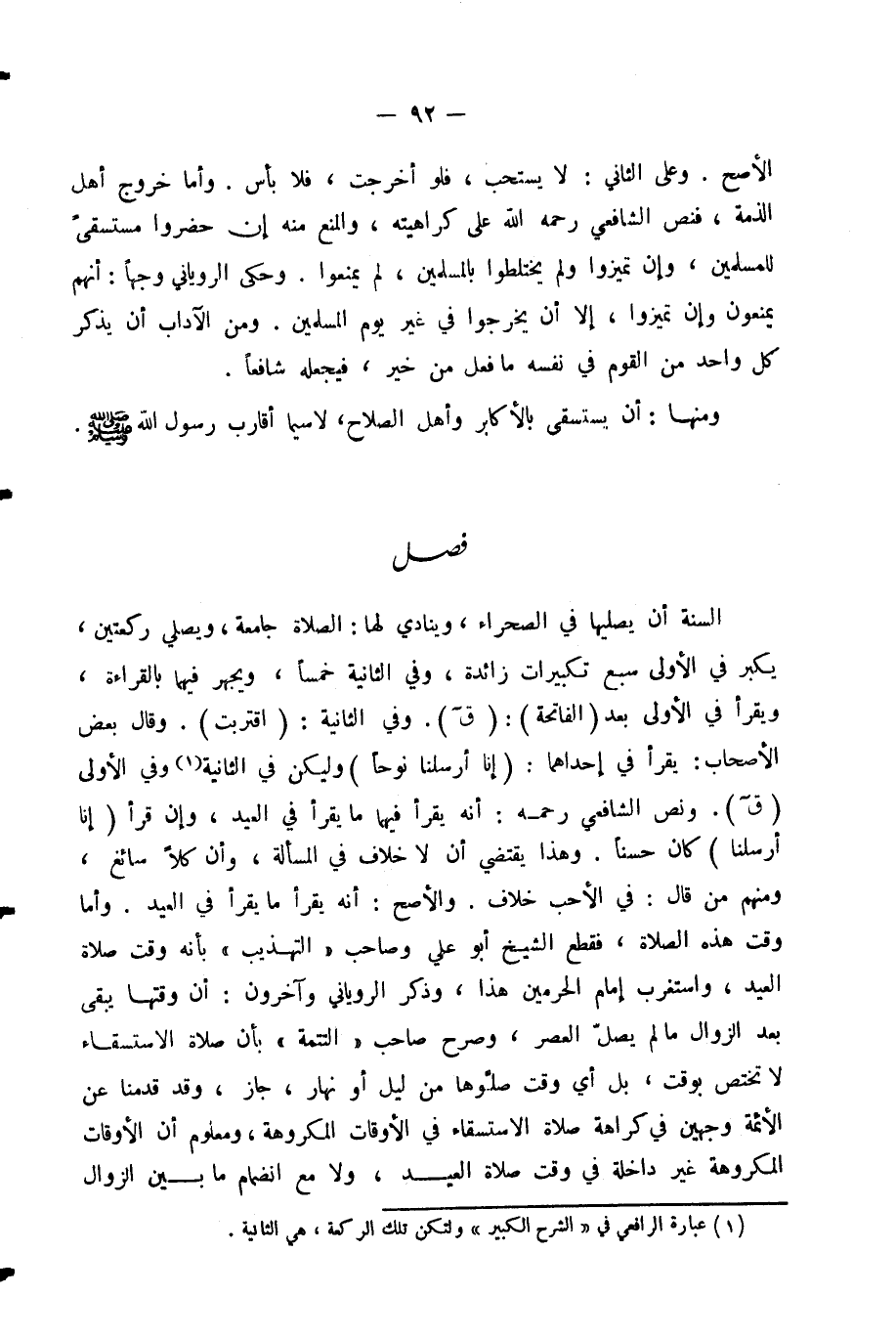 السُّنَّةُ أَنْ يُصَلِّيَهَا فِي الصَّحْرَاءِ، وَيُنَادِيَ لَهَا: الصَّلَاةُ جَامِعَةٌ، وَيُصَلِّيَ رَكْعَتَيْنِ، يُكَبِّرُ فِي الْأُولَى سَبْعَ تَكْبِيرَاتٍ زَائِدَةٍ، وَفِي الثَّانِيَةِ خَمْسًا، وَيَجْهَرُ فِيهِمَا بِالْقِرَاءَةِ، وَيَقْرَأُ فِي الْأُولَى بَعْدَ (الْفَاتِحَةِ) : (ق) . وَفِي الثَّانِيَةِ: (اقْتَرَبَتْ) . وَقَالَ بَعْضُ الْأَصْحَابِ: يَقْرَأُ فِي إِحْدَاهُمَا: (إِنَّا أَرْسَلْنَا نُوحًا) وَلْيَكُنْ فِي الثَّانِيَةِ وَفِي الْأُولَى (ق) . وَنَصَّ الشَّافِعِيُّ - رَحِمَهُ اللَّهُ -: أَنَّهُ يَقْرَأُ فِيهِمَا مَا يَقْرَأُ فِي الْعِيدِ، وَإِنْ قَرَأَ (إِنَّا أَرْسَلْنَا) كَانَ حَسَنًا. وَهَذَا يَقْتَضِي أَنْ لَا خِلَافَ فِي الْمَسْأَلَةِ، وَأَنَّ كُلًّا سَائِغٌ، وَمِنْهُمْ مَنْ قَالَ: فِي الْأَحَبِّ خِلَافٌ. وَالْأَصَحُّ: أَنَّهُ يَقْرَأُ مَا يَقْرَأُ فِي الْعِيدِ. وَأَمَّا وَقْتُ هَذِهِ الصَّلَاةِ، فَقَطَعَ الشَّيْخُ أَبُو عَلِيٍّ وَصَاحِبُ (التَّهْذِيبِ) بِأَنَّهُ وَقْتُ صَلَاةِ الْعِيدِ، وَاسْتَغْرَبَ إِمَامُ الْحَرَمَيْنِ هَذَا، وَذَكَرَ الرُّويَانِيُّ وَآخَرُونَ: أَنَّ وَقْتَهَا يَبْقَى بَعْدَ الزَّوَالِ مَا لَمْ يُصَلِّ الْعَصْرَ، وَصَرَّحَ صَاحِبُ (التَّتِمَّةِ) بِأَنَّ صَلَاةَ الِاسْتِسْقَاءِ لَا تَخْتَصُّ بِوَقْتٍ، بَلْ أَيَّ وَقْتٍ صَلَّوْهَا مِنْ لَيْلٍ أَوْ نَهَارٍ، جَازَ، وَقَدْ قَدَّمْنَا عَنِ الْأَئِمَّةِ وَجْهَيْنِ فِي كَرَاهَةِ صَلَاةِ الِاسْتِسْقَاءِ فِي الْأَوْقَاتِ الْمَكْرُوهَةِ، وَمَعْلُومٌ أَنَّ الْأَوْقَاتَ الْمَكْرُوهَةَ غَيْرُ دَاخِلَةٍ فِي حُكْمِ وَقْتِ صَلَاةِ الْعِيدَيْنِ، وَلَا مَعَ انْضِمَامِ مَا بَيْنَ الزَّوَالِ
