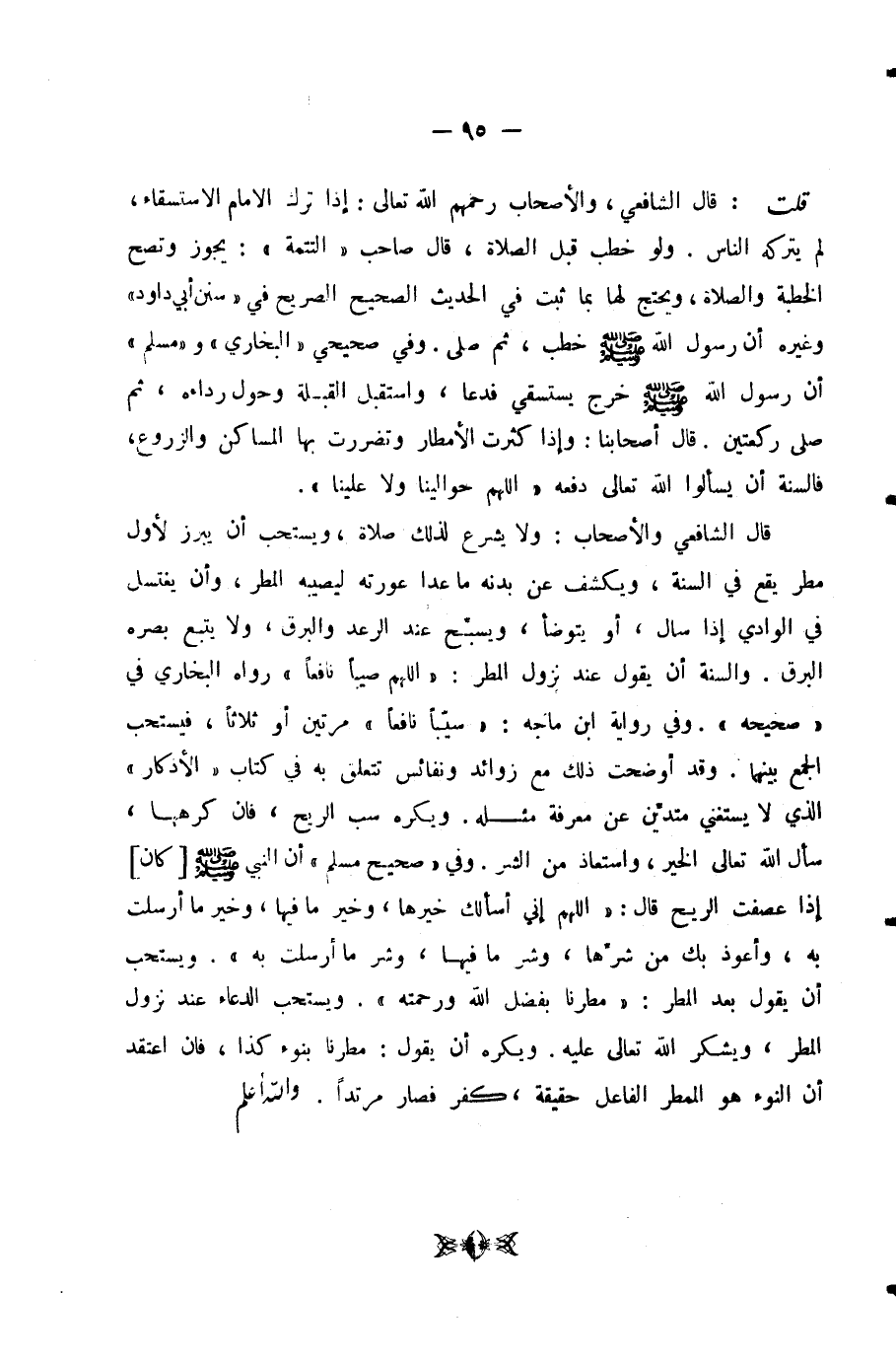 قُلْتُ: قَالَ الشَّافِعِيُّ، وَالْأَصْحَابُ - رَحِمَهُمُ اللَّهُ تَعَالَى -: إِذَا تَرَكَ الْإِمَامُ الِاسْتِسْقَاءَ، لَمْ يَتْرُكْهُ النَّاسُ. وَلَوْ خَطَبَ قَبْلَ الصَّلَاةِ، قَالَ صَاحِبُ (التَّتِمَّةِ) : يَجُوزُ وَتَصِحُّ الْخُطْبَةُ وَالصَّلَاةُ، وَيَحْتَجُّ لَهَا بِمَا ثَبَتَ فِي الْحَدِيثِ الصَّحِيحِ الصَّرِيحِ فِي (سُنَنِ أَبِي دَاوُدَ) وَغَيْرِهِ أَنَّ رَسُولَ اللَّهِ - صَلَّى اللَّهُ عَلَيْهِ وَسَلَّمَ - خَطَبَ ثُمَّ صَلَّى. وَفِي صَحِيحَيِ (الْبُخَارِيِّ) وَ (مُسْلِمٍ) أَنَّ رَسُولَ اللَّهِ - صَلَّى اللَّهُ عَلَيْهِ وَسَلَّمَ - خَرَجَ يَسْتَسْقِي فَدَعَا، وَاسْتَقْبَلَ الْقِبْلَةَ وَحَوَّلَ رِدَاءَهُ، ثُمَّ صَلَّى رَكْعَتَيْنِ. قَالَ أَصْحَابُنَا: وَإِذَا كَثُرَتِ الْأَمْطَارُ وَتَضَرَّرَتْ بِهَا الْمَسَاكِنُ وَالزُّرُوعُ، فَالسُّنَّةُ أَنْ يَسْأَلُوا اللَّهَ تَعَالَى دَفْعَهُ (اللَّهُمَّ حَوَالَيْنَا وَلَا عَلَيْنَا) . قَالَ الشَّافِعِيُّ وَالْأَصْحَابُ: وَلَا يُشْرَعُ لِذَلِكَ صَلَاةٌ، وَيُسْتَحَبُّ أَنْ يَبْرُزَ لِأَوَّلِ مَطَرٍ يَقَعُ فِي السَّنَةِ وَيَكْشِفَ مِنْ بَدَنِهِ مَا عَدَا عَوْرَتَهُ لِيُصِيبَهُ الْمَطَرُ، وَأَنْ يَغْتَسِلَ فِي الْوَادِي إِذَا سَالَ، أَوْ يَتَوَضَّأَ، وَيُسَبِّحَ عِنْدَ الرَّعْدِ وَالْبَرْقِ، وَلَا يُتْبِعَ بَصَرَهُ الْبَرْقَ. وَالسُّنَّةُ أَنْ يَقُولَ عِنْدَ نُزُولِ الْمَطَرِ: (اللَّهُمَّ صَيِّبًا نَافِعًا) رَوَاهُ الْبُخَارِيُّ فِي (صَحِيحِهِ) . وَفِي رِوَايَةِ ابْنِ مَاجَهْ: (سَيِّبًا نَافِعًا) مَرَّتَيْنِ أَوْ ثَلَاثًا، فَيُسْتَحَبُّ الْجَمْعُ بَيْنَهُمَا. وَقَدْ أَوْضَحْتُ ذَلِكَ مَعَ زَوَائِدَ وَنَفَائِسَ تَتَعَلَّقُ بِهِ فِي كِتَابِ (الْأَذْكَارِ) الَّذِي لَا يَسْتَغْنِي مُتَدَيِّنٌ عَنْ مَعْرِفَةِ مِثْلِهِ. وَيُكْرَهُ سَبُّ الرِّيحِ، فَإِنْ كَرِهَهَا، سَأَلَ اللَّهَ تَعَالَى الْخَيْرَ، وَاسْتَعَاذَ مِنَ الشَّرِّ. وَفِي (صَحِيحِ مُسْلِمٍ) أَنَّ النَّبِيَّ - صَلَّى اللَّهُ عَلَيْهِ وَسَلَّمَ -