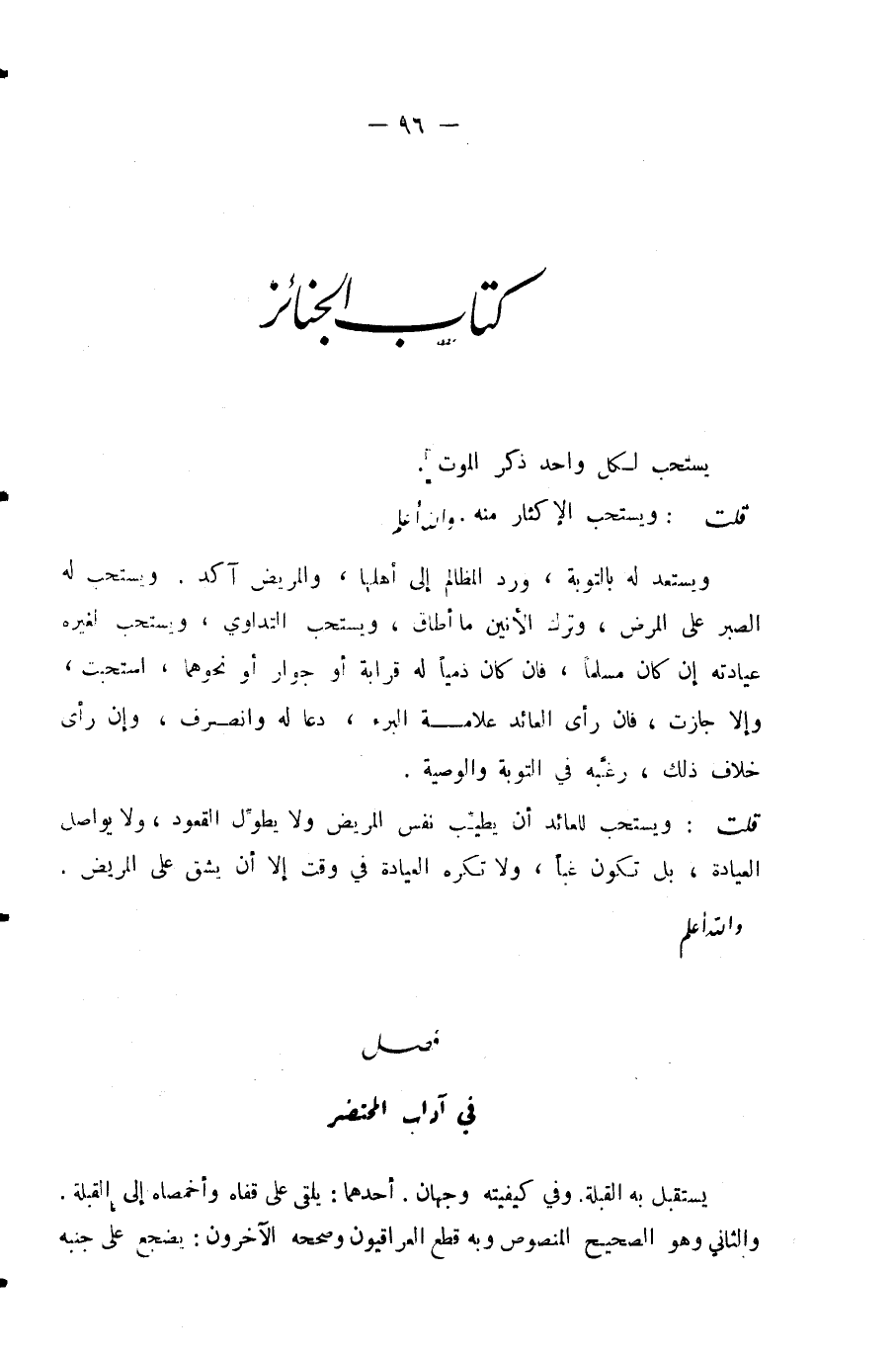 وَيَسْتَعِدُّ لَهُ بِالتَّوْبَةِ، وَرَدِّ الْمَظَالِمِ إِلَى أَهْلِهَا، وَالْمَرِيضُ آكَدُ. وَيُسْتَحَبُّ لَهُ الصَّبْرُ عَلَى الْمَرَضِ، وَتَرْكُ الْأَنِينِ مَا أَطَاقَ، وَيُسْتَحَبُّ التَّدَاوِي، وَيُسْتَحَبُّ لِغَيْرِهِ عِيَادَتُهُ إِنْ كَانَ مُسْلِمًا، فَإِنْ كَانَ ذِمِّيًّا لَهُ قَرَابَةٌ أَوْ جِوَارٌ أَوْ نَحْوُهُمَا، اسْتُحِبَّتْ، وَإِلَّا جَازَتْ، فَإِنْ رَأَى الْعَائِدُ عَلَامَةَ الْبُرْءِ، دَعَا وَانْصَرَفَ، وَإِنْ رَأَى خِلَافَ ذَلِكَ، رَغَّبَهُ فِي التَّوْبَةِ وَالْوَصِيَّةِ.