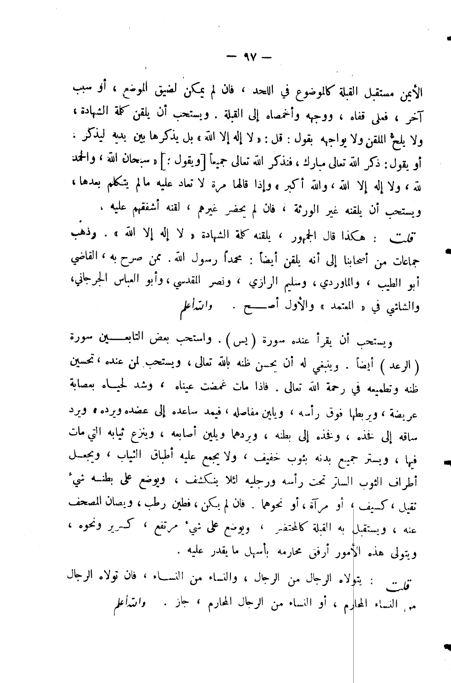 وَيُسْتَحَبُّ أَنْ يُقْرَأَ عِنْدَهُ (يس) . وَاسْتَحَبَّ بَعْضُ التَّابِعِينَ سُورَةَ (الرَّعْدِ) أَيْضًا. وَيَنْبَغِي لَهُ أَنْ يُحْسِنَ ظَنَّهُ بِاللَّهِ تَعَالَى، وَيُسْتَحَبُّ لِمَنْ عِنْدَهُ، تَحْسِينُ ظَنِّهِ وَتَطْمِيعُهُ فِي رَحْمَةِ اللَّهِ تَعَالَى. فَإِذَا مَاتَ غُمِّضَتْ عَيْنَاهُ، وَشُدَّ لَحْيَاهُ بِعِصَابَةٍ عَرِيضَةٍ، وَيَرْبُطُهَا فَوْقَ رَأْسِهِ، وَيُلَيِّنُ مَفَاصِلَهُ، فَيَمُدُّ سَاعِدَهُ إِلَى عَضُدِهِ وَيَرُدُّهُ، وَيَرُدُّ سَاقَهُ إِلَى فَخِذِهِ، وَفَخِذَهُ إِلَى بَطْنِهِ، وَيَرُدُّهُمَا وَيُلَيِّنُ أَصَابِعَهُ، وَيَنْزِعُ ثِيَابَهُ الَّتِي مَاتَ فِيهَا، وَيَسْتُرُ جَمِيعَ بَدَنِهِ بِثَوْبٍ خَفِيفٍ، وَلَا يَجْمَعُ عَلَيْهِ أَطْبَاقَ الثِّيَابِ، وَيَجْعَلُ أَطْرَافَ الثَّوْبِ السَّاتِرِ تَحْتَ رَأْسِهِ وَرِجْلَيْهِ لِئَلَّا يَنْكَشِفَ، وَيُوضَعُ عَلَى بَطْنِهِ شَيْءٌ ثَقِيلٌ، كَسَيْفٍ، أَوْ مِرْآةٍ، أَوْ نَحْوِهِمَا. فَإِنْ لَمْ يَكُنْ، فَطِينٌ رَطْبٌ، وَيُصَانُ الْمُصْحَفُ عَنْهُ، وَيُسْتَقْبَلُ بِهِ الْقِبْلَةَ كَالْمُحْتَضَرِ، وَيُوضَعُ عَلَى شَيْءٍ مُرْتَفِعٍ، كَسَرِيرٍ وَنَحْوِهِ، وَيَتَوَلَّى هَذِهِ الْأُمُورَ أَرْفَقُ مَحَارِمِهِ بِأَسْهَلِ مَا يَقْدِرُ عَلَيْهِ.