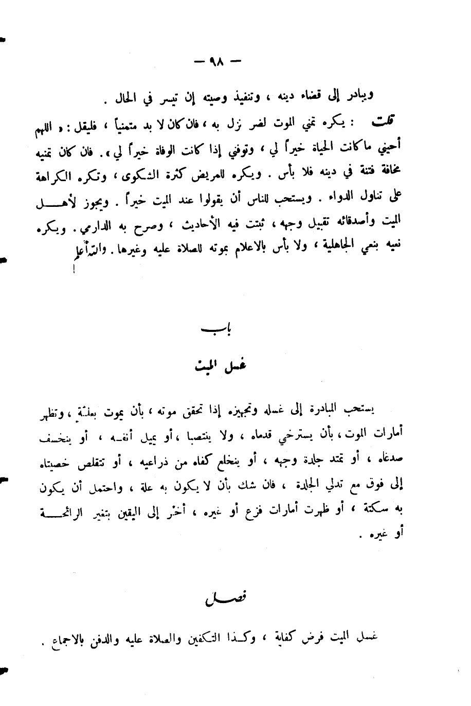 قُلْتُ: يُكْرَهُ تَمَنِّي الْمَوْتِ لِضُرٍّ نَزَلَ بِهِ، فَإِنْ كَانَ لَا بُدَّ مُتَمَنِّيًا، فَلْيَقُلْ: (اللَّهُمَّ أَحْيِنِي مَا كَانَتِ الْحَيَاةُ خَيْرًا لِي، وَتَوَفَّنِي إِذَا كَانَتِ الْوَفَاةُ خَيْرًا لِي) . فَإِنْ كَانَ تَمَنِّيهِ مَخَافَةَ فِتْنَةٍ فِي دِينِهِ فَلَا بَأْسَ. وَيُكْرَهُ لِلْمَرِيضِ كَثْرَةُ الشَّكْوَى، وَتُكْرَهُ الْكَرَاهَةُ عَلَى تَنَاوُلِ الدَّوَاءِ. وَيُسْتَحَبُّ لِلنَّاسِ أَنْ يَقُولُوا عِنْدَ الْمَيِّتِ خَيْرًا. وَيَجُوزُ لِأَهْلِ الْمَيِّتِ وَأَصْدِقَائِهِ تَقْبِيلُ وَجْهِهِ، ثَبَتَتْ فِيهِ الْأَحَادِيثُ، وَصَرَّحَ بِهِ الدَّارِمِيُّ. وَيُكْرَهُ نَعْيُهُ بِنَعْيِ الْجَاهِلِيَّةِ، وَلَا بَأْسَ بِالْإِعْلَامِ بِمَوْتِهِ لِلصَّلَاةِ عَلَيْهِ وَغَيْرِهَا. - وَاللَّهُ أَعْلَمُ -.