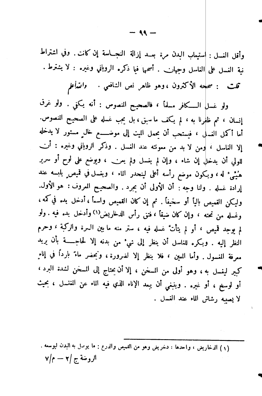 وَلَوْ غَسَّلَ الْكَافِرُ مُسْلِمًا، فَالصَّحِيحُ الْمَنْصُوصُ: أَنَّهُ يَكْفِي. وَلَوْ غَرِقَ إِنْسَانٌ، ثُمَّ ظَفِرْنَا بِهِ، لَمْ يَكْفِ مَا سَبَقَ، بَلْ يَجِبُ غَسْلُهُ عَلَى الصَّحِيحِ الْمَنْصُوصِ. أَمَّا أَكْمَلُ الْغُسْلِ، فَيُسْتَحَبُّ أَنْ يُحْمَلَ الْمَيِّتُ إِلَى مَوْضِعٍ خَالٍ مَسْتُورٍ لَا يَدْخُلُهُ إِلَّا الْغَاسِلُ، وَمَنْ لَا بُدَّ مِنْ مَعُونَتِهِ عِنْدَ الْغُسْلِ. وَذَكَرَ الرُّويَانِيُّ وَغَيْرُهُ: أَنَّ لِلْوَلِيِّ أَنْ يَدْخُلَ إِنْ شَاءَ، وَإِنْ لَمْ يُغَسِّلْ وَلَمْ يُعِنْ، وَيُوضَعُ عَلَى لَوْحٍ أَوْ سَرِيرٍ هُيِّئَ لَهُ، وَيَكُونُ مَوْضِعُ رَأْسِهِ أَعْلَى لِيَنْحَدِرَ الْمَاءُ، وَيُغَسَّلُ فِي قَمِيصٍ يُلْبَسُهُ عِنْدَ إِرَادَتِهِ غُسْلَهُ. وَلَنَا وَجْهٌ: أَنَّ الْأَوْلَى أَنْ يُجَرَّدَ. وَالصَّحِيحُ الْمَعْرُوفُ: هُوَ الْأَوَّلُ. وَلْيَكُنِ الْقَمِيصُ بَالِيًا أَوْ سَخِيفًا. ثُمَّ إِنْ كَانَ الْقَمِيصُ وَاسِعًا، أَدْخَلَ يَدَهُ فِي كُمِّهِ، وَغَسَلَ مِنْ تَحْتِهِ، وَإِنْ كَانَ ضَيِّقًا، فَتَقَ رَأَسَ الدَّخَارِيضِ وَأَدْخَلَ يَدَهُ فِيهِ. وَلَوْ لَمْ يُوجَدْ قَمِيصٌ، أَوْ لَمْ يَتَأَتَّ غُسْلُهُ فِيهِ، سَتَرَ مِنْهُ مَا بَيْنَ السُّرَّةِ وَالرُّكْبَةِ، وَحَرُمَ النَّظَرُ إِلَيْهِ. وَيُكْرَهُ لِلْغَاسِلِ أَنْ يَنْظُرَ إِلَى شَيْءٍ مِنْ بَدَنِهِ إِلَّا لِحَاجَةٍ بِأَنْ يُرِيدَ مَعْرِفَةَ الْمَغْسُولِ. وَأَمَّا الْمُعِينُ، فَلَا يَنْظُرُ إِلَّا لِضَرُورَةٍ، وَيُحْضِرُ مَاءً بَارِدًا فِي إِنَاءٍ كَبِيرٍ لِيَغْسِلَ بِهِ، وَهُوَ أَوْلَى مِنَ الْمُسَخَّنِ، إِلَّا أَنْ يُحْتَاجَ إِلَى الْمُسَخَّنِ لِشِدَّةِ الْبَرْدِ، أَوْ لِوَسَخٍ، أَوْ غَيْرِهِ. وَيَنْبَغِي أَنْ يَبْعُدَ الْإِنَاءَ الَّذِي فِيهِ الْمَاءُ عَنِ الْمُغْتَسَلِ، بِحَيْثُ لَا يُصِيبُهُ رَشَاشُ الْمَاءِ عِنْدَ الْغُسْلِ.