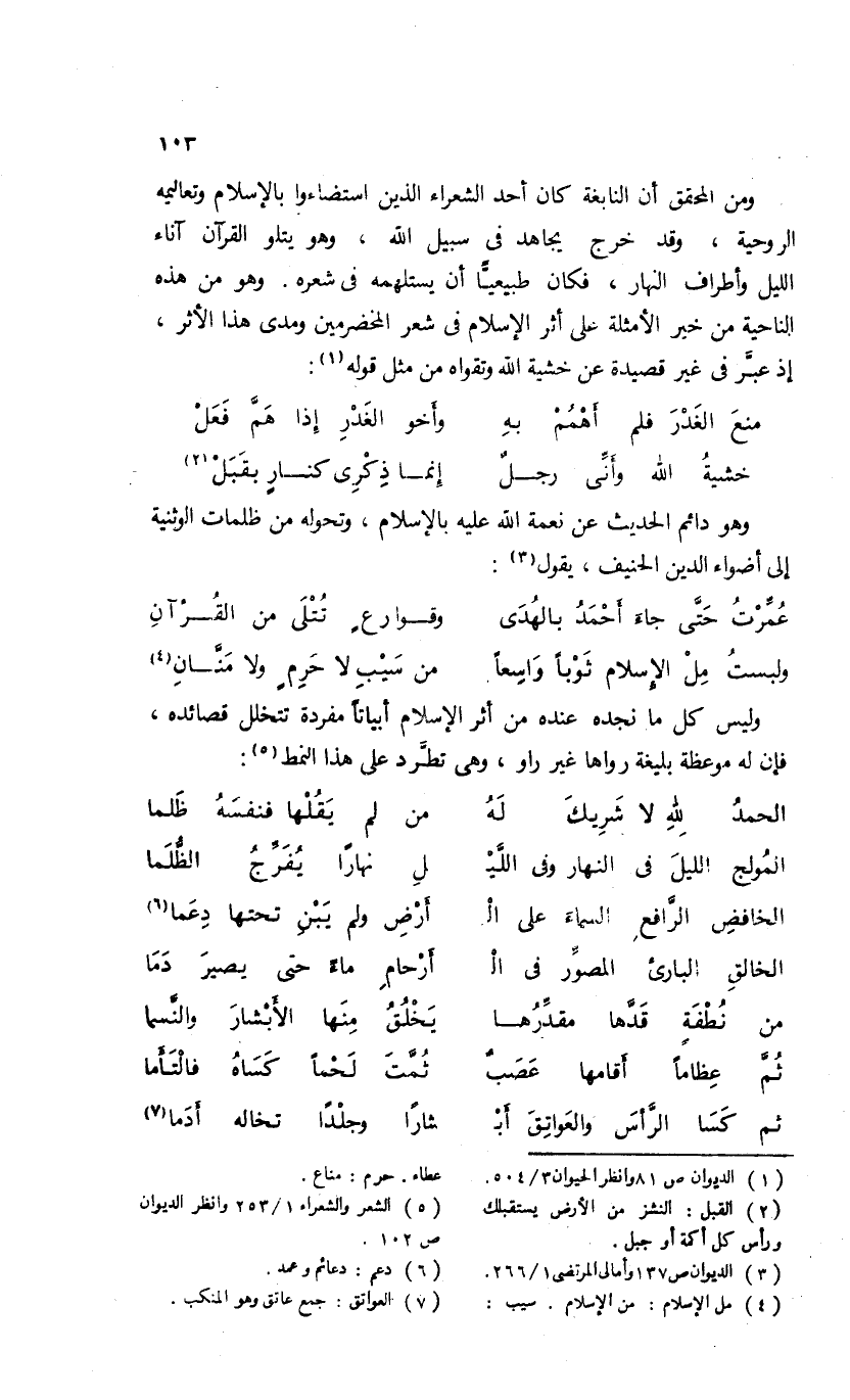 ومن المحقق أن النابغة كان أحد الشعراء الذين استضاءوا بالإسلام وتعاليمه الروحية، وقد خرج يجاهد فى سبيل الله، وهو يتلو القرآن آناء الليل وأطراف النهار، فكان طبيعيّا أن يستلهمه فى شعره. وهو من هذه الناحية من خير الأمثلة على أثر الإسلام فى شعر المخضرمين ومدى هذا الأثر، إذ عبّر فى غير قصيدة عن خشية الله وتقواه من مثل قوله (¬1):