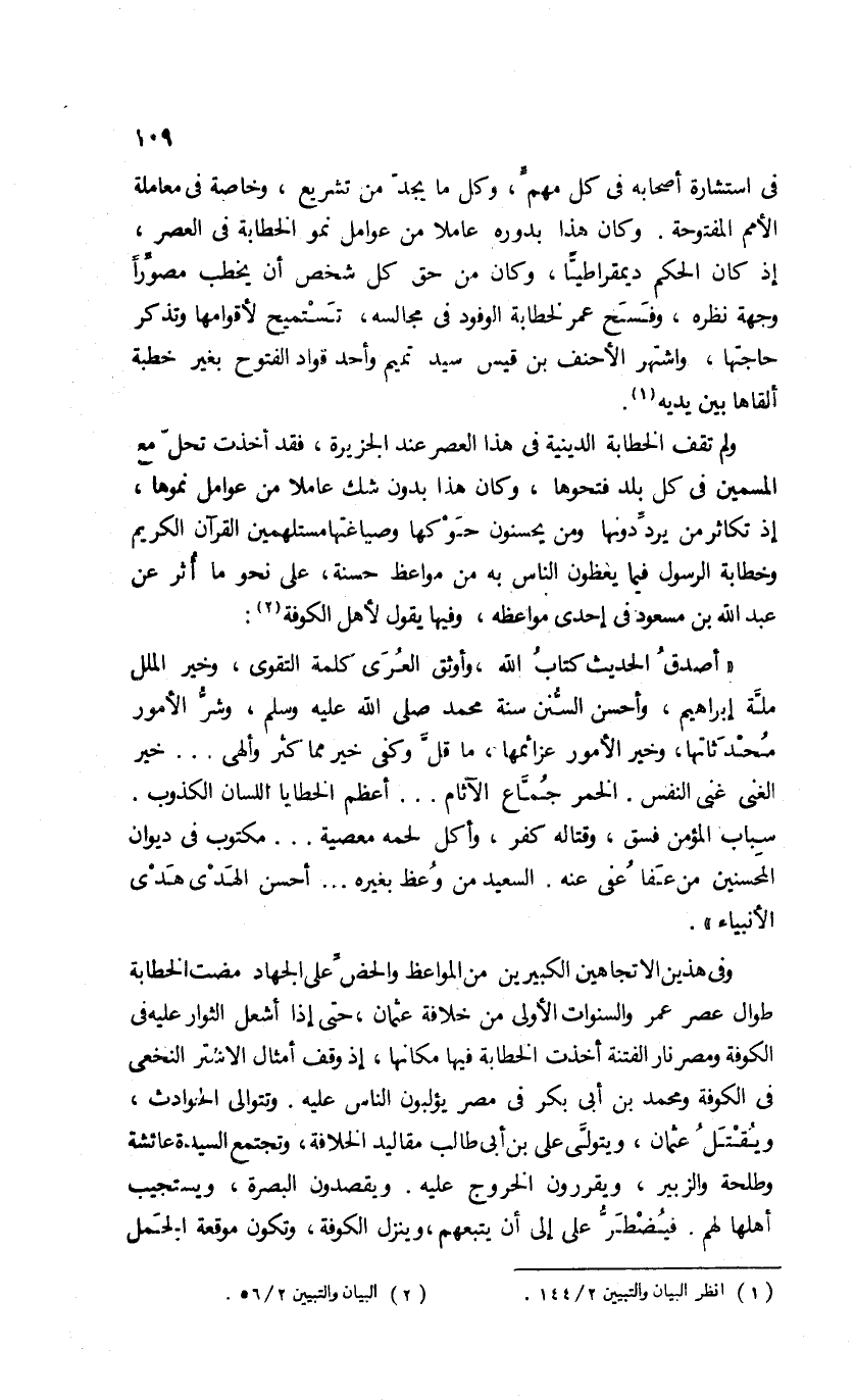 «أصدق الحديث كتاب الله، وأوثق العرى كلمة التقوى، وخير الملل ملّة إبراهيم، وأحسن السّنن سنة محمد صلى الله عليه وسلم، وشرّ الأمور محدثاتها، وخير الأمور عزائمها، ما قلّ وكفى خير مما كثر وألهى. . . خير الغنى غنى النفس. الخمر جمّاع الآثام. . . أعظم الخطايا اللسان الكذوب.