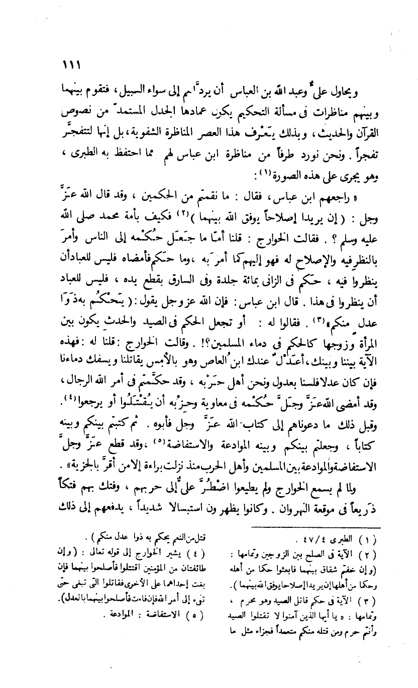 «راجعهم ابن عباس، فقال: ما نقمتم من الحكمين، وقد قال الله عزّ وجل: {(إِنْ يُرِيدا إِصْلاحاً يُوَفِّقِ اللهُ بَيْنَهُما)} (¬2) فكيف بأمة محمد صلى الله عليه وسلم؟ . فقالت الخوارج: قلنا أمّا ما جعل حكمه إلى الناس وأمر بالنظر فيه والإصلاح له فهو إليهم كما أمر به، وما حكم فأمضاه فليس للعباد أن ينظروا فيه، حكم فى الزانى بمائة جلدة وفى السارق بقطع يده، فليس للعباد أن ينظروا فى هذا. قال ابن عباس: فإن الله عز وجل يقول: {(يَحْكُمُ بِهِ ذَوا عَدْلٍ مِنْكُمْ»} (¬3). فقالوا له: أو تجعل الحكم فى الصيد والحدث يكون بين المرأة وزوجها كالحكم فى دماء المسلمين؟ ! . وقالت الخوارج: قلنا له: فهذه الآية بيننا وبينك، أعدل عندك ابن العاص وهو بالأمس يقاتلنا ويسفك دماءنا فإن كان عدلا فلسنا بعدول ونحن أهل حربه، وقد حكّمتم فى أمر الله الرجال، وقد أمضى الله عزّ وجلّ حكمه فى معاوية وحزبه أن يقتلوا أو يرجعوا (¬4) وقبل ذلك ما دعوناهم إلى كتاب الله عزّ وجل فأبوه. ثم كتبتم بينكم وبينه كتابا، وجعلتم بينكم وبينه الموادعة والاستفاضة (¬5). وقد قطع عزّ وجلّ الاستفاضة والموادعة بين المسلمين وأهل الحرب منذ نزلت براءة إلا من أقرّ بالجزية».