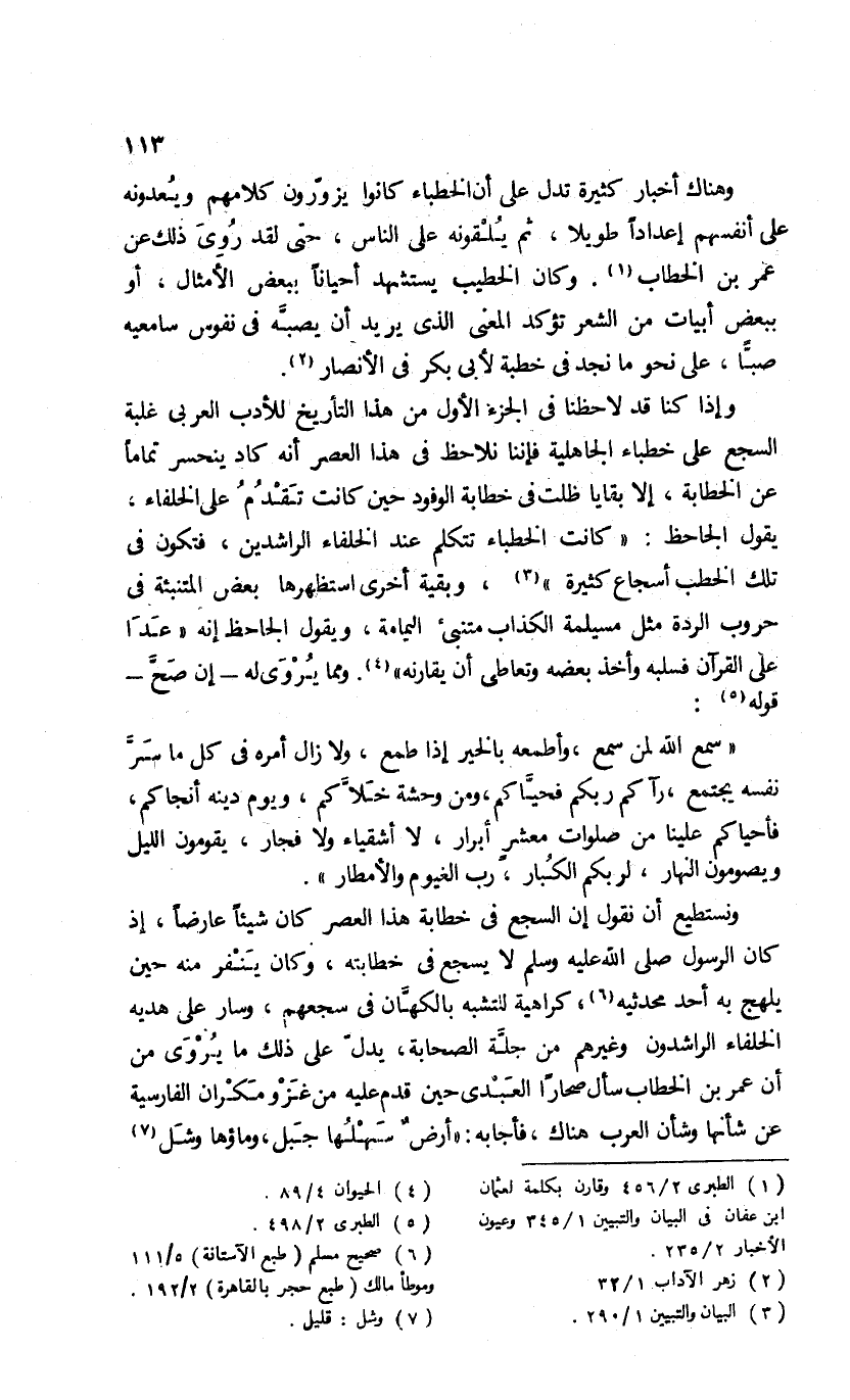 ونستطيع أن نقول إن السجع فى خطابة هذا العصر كان شيئا عارضا، إذ كان الرسول صلى الله عليه وسلم لا يسجع فى خطابته، وكان ينفر منه حين يلهج به أحد محدثيه (¬6)، كراهية للتشبه بالكهّان فى سجعهم، وسار على هديه الخلفاء الراشدون وغيرهم من جلّة الصحابة، يدلّ على ذلك ما يروى من أن عمر بن الخطاب سأل صحارا العبدى حين قدم عليه من غزو مكران الفارسية عن شأنها وشأن العرب هناك، فأجابه: «أرض سهلها جبل، وماؤها وشل (¬7)