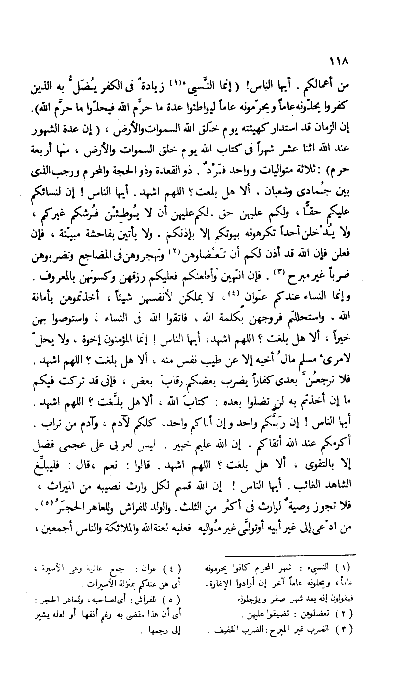 إن الزمان قد استدار كهيئته يوم خلق الله السموات والأرض، {(إِنَّ عِدَّةَ الشُّهُورِ عِنْدَ اللهِ اِثْنا عَشَرَ شَهْراً فِي كِتابِ اللهِ يَوْمَ خَلَقَ السَّماواتِ وَالْأَرْضَ، مِنْها أَرْبَعَةٌ حُرُمٌ): } ثلاثة متواليات وواحد فرد. ذو القعدة وذو الحجة والمحرم ورجب الذى بين جمادى وشعبان، ألا هل بلغت؟ اللهم اشهد. أيها الناس! إن لنسائكم عليكم حقّا، ولكم عليهن حق، لكم عليهن أن لا يوطئن فرشكم غيركم، ولا يدخلن أحدا تكرهونه بيوتكم إلا بإذنكم، ولا يأتين بفاحشة مبيّنة، فإن فعلن فإن الله قد أذن لكم أن تعضلوهن (¬2) وتهجروهن فى المضاجع وتضربوهن ضربا غير مبرح (¬3). فإن انتهين وأطعنكم فعليكم رزقهن وكسوتهن بالمعروف.