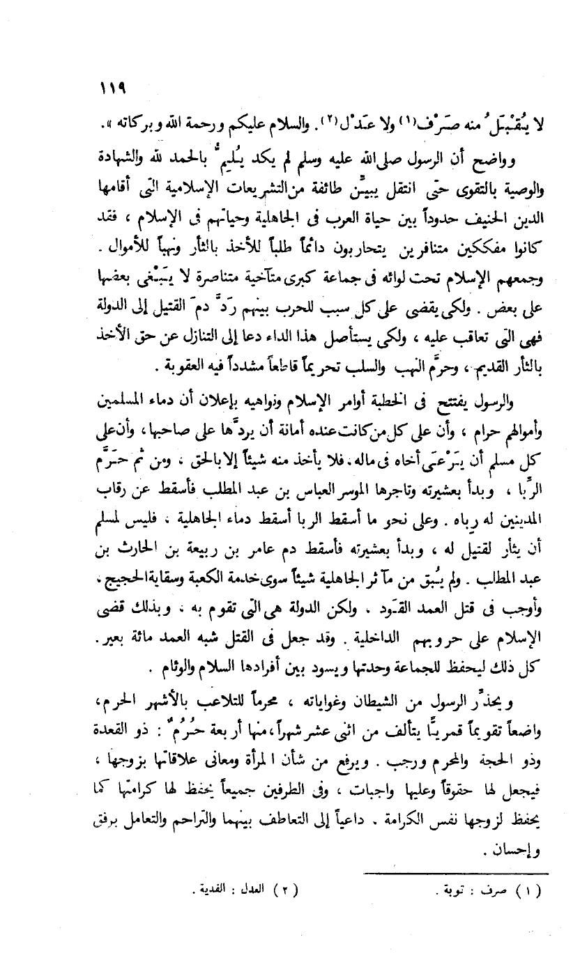 والرسول يفتتح فى الخطبة أوامر الإسلام ونواهيه بإعلان أن دماء المسلمين وأموالهم حرام، وأن على كل من كانت عنده أمانة أن يردّها على صاحبها، وأن على كل مسلم أن يرعى أخاه فى ماله. فلا يأخذ منه شيئا إلا بالحق، ومن ثم حرّم الرّبا، وبدأ بعشيرته وتاجرها الموسر العباس بن عبد المطلب فأسقط عن رقاب المدينين له رباه. وعلى نحو ما أسقط الربا أسقط دماء الجاهلية، فليس لمسلم أن يثأر لقتيل له، وبدأ بعشيرته فأسقط دم عامر بن ربيعة بن الحارث بن عبد المطلب. ولم يبق من مآثر الجاهلية شيئا سوى خدمة الكعبة وسقاية الحجيج، وأوجب فى قتل العمد القود، ولكن الدولة هى التى تقوم به، وبذلك قضى الإسلام على حروبهم الداخلية. وقد جعل فى القتل شبه العمد مائة بعير.