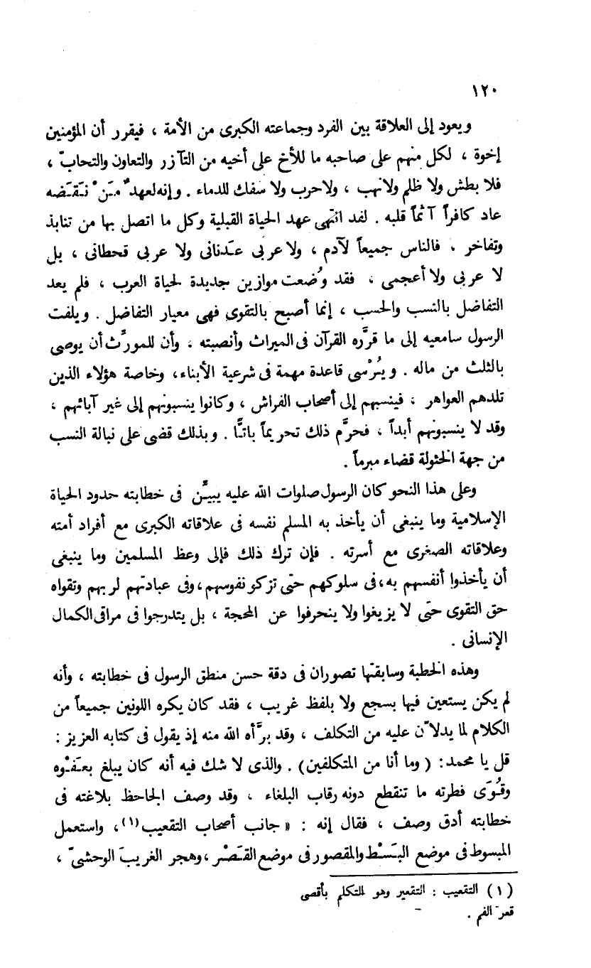 ويعود إلى العلاقة بين الفرد وجماعته الكبرى من الأمة، فيقرر أن المؤمنين إخوة، لكل منهم على صاحبه ما للأخ على أخيه من التآزر والتعاون والتحابّ، فلا بطش ولا ظلم ولا نهب، ولا حرب ولا سفك للدماء. وإنه لعهد من نقضه عاد كافرا آثما قلبه. لقد انتهى عهد الحياة القبلية وكل ما أتصل بها من تنابذ وتفاخر، فالناس جميعا لآدم، ولا عربى عدنانى ولا عربى قحطانى، بل لا عربى ولا أعجمى، فقد وضعت موازين جديدة لحياة العرب، فلم يعد التفاضل بالنسب والحسب، إنما أصبح بالتقوى فهى معيار التفاضل. ويلفت الرسول سامعيه إلى ما قرّره القرآن فى الميراث وأنصبته. وأن للمورّث أن يوصى بالثلث من ماله. ويرسى قاعدة مهمة فى شرعية الأبناء، وخاصة هؤلاء الذين تلدهم العواهر، فينسبهم إلى أصحاب الفراش، وكانوا ينسبونهم إلى غير آبائهم، وقد لا ينسبونهم أبدا، فحرّم ذلك تحريما باتّا. وبذلك قضى على نبالة النسب من جهة الخئولة قضاء مبرما.