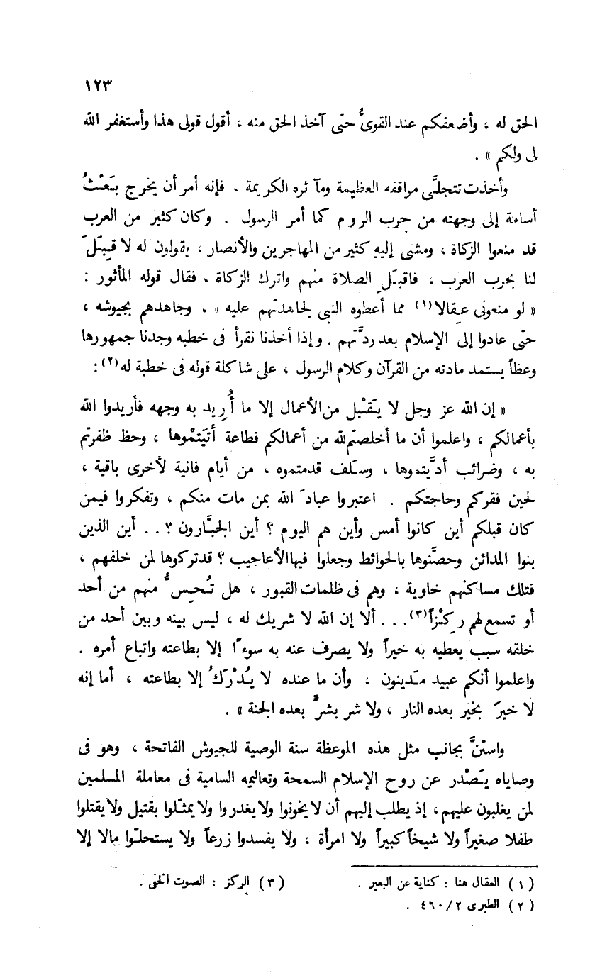 «لو منعونى عقالا (¬1) مما أعطوه النبى لجاهدتهم عليه»، وجاهدهم بجيوشه، حتى عادوا إلى الإسلام بعد ردّتهم. وإذا أخذنا نقرأ فى خطبه وجدنا جمهورها وعظا يستمد مادته من القرآن وكلام الرسول، على شاكلة قوله فى خطبة له (¬2):