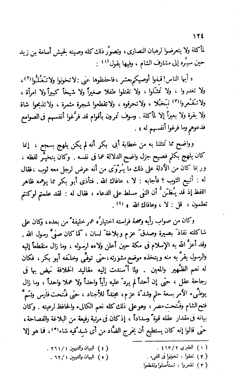 لمأكلة ولا يتعرضوا لرهبان النصارى، وتصوّر ذلك كله وصيته لجيش أسامة بن زيد حين سيّره إلى مشارف الشام، وفيها يقول (¬1):