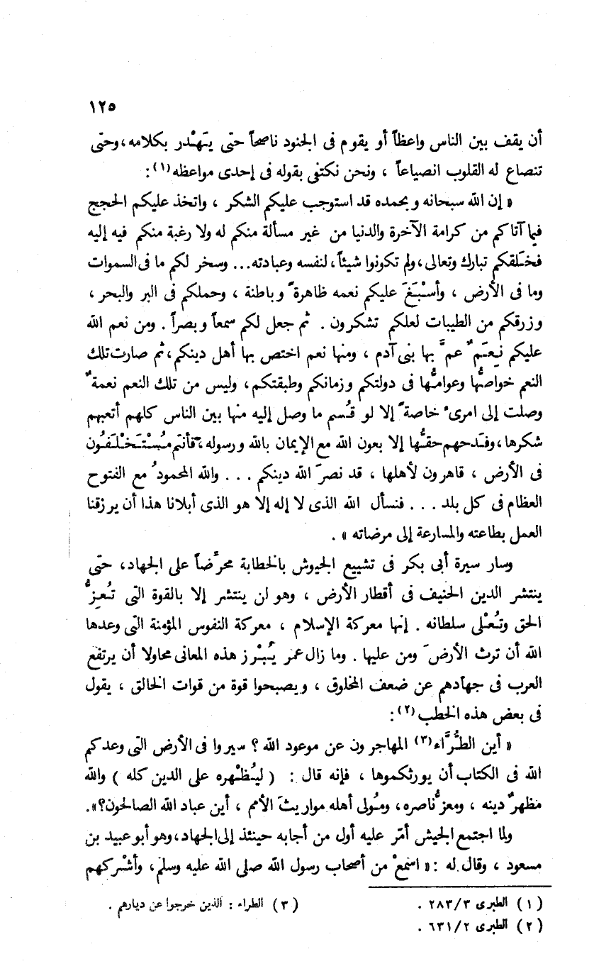 «إن الله سبحانه وبحمده قد استوجب عليكم الشكر، واتخذ عليكم الحجج فيما آتاكم من كرامة الآخرة والدنيا من غير مسألة منكم له ولا رغبة منكم فيه إليه فخلقكم تبارك وتعالى، ولم تكونوا شيئا، لنفسه وعبادته. . . وسخر لكم ما فى السموات وما فى الأرض، وأسبغ عليكم نعمه ظاهرة وباطنة، وحملكم فى البر والبحر، وزرقكم من الطيبات لعلكم تشكرون. ثم جعل لكم سمعا وبصرا. ومن نعم الله عليكم نعم عمّ بها بنى آدم، ومنها نعم اختص بها أهل دينكم، ثم صارت تلك النعم خواصّها وعوامّها فى دولتكم وزمانكم وطبقتكم، وليس من تلك النعم نعمة وصلت إلى امرئ خاصة إلا لو قسم ما وصل إليه منها بين الناس كلهم أتعبهم شكرها، وفدحهم حقّها إلا بعون الله مع الإيمان بالله ورسوله، فأنتم مستخلفون فى الأرض، قاهرون لأهلها، قد نصر الله دينكم. . . والله المحمود مع الفتوح العظام فى كل بلد. . . فنسأل الله الذى لا إله إلا هو الذى أبلانا هذا أن يرزقنا العمل بطاعته والمسارعة إلى مرضاته».