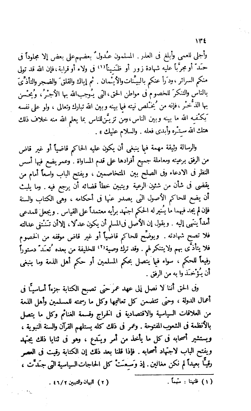 والرسالة وثيقة مهمة فيما ينبغى أن يكون عليه الحاكم قاضيا أو غير قاض من الرفق برعيته ومعاملة جميع أفرادها على قدم المساواة. وعمر يضع فيها أسس النظر فى الادعاء وفى الصلح بين المتخاصمين، ويفتح الباب واسعا أمام من يقضى فى شأن من شئون الرعية ويتبين خطأ قضائه أن يرجع فيه. وما يلبث أن يضع للحاكم الأصول التى يصدر عنها فى أحكامه، وهى الكتاب والسنة فإن لم يجد فيهما ما ينير له الحكم اجتهد برأيه معتمدا على القياس. ويجعل للمدعى أمدا ينتهى إليه. ويقول إن الأصل فى المسلم أن يكون عدلا، إلا أن تنتفى عدالته فلا تصح شهادته. ويوضّح للحاكم قاضيا أو غير قاض موقفه من الخصوم فلا يتأذّى بهم ولا يتنكر لهم. وقد ترك وصية (¬2) للخليفة من بعده تعدّ دستورا رفيعا للحكم، سواء فيما يتصل بحكم المسلمين أو حكم أهل الذمة وما ينبغى أن يؤخذوا به من الرفق.