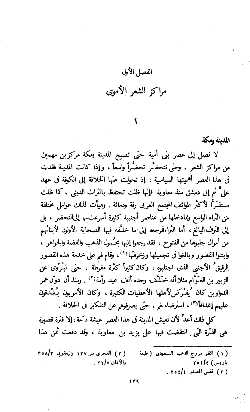 لا نصل إلى عصر بنى أمية حتى تصبح المدينة ومكة مركزين مهمين من مراكز الشعر، وحتى تتحضّر تحضّرا واسعا، وإذا كانت المدينة فقدت فى هذا العصر أهميتها السياسية، إذ تحولت عنها الخلافة إلى الكوفة فى عهد علىّ ثم إلى دمشق منذ معاوية فإنها ظلت تحتفظ بالتراث الدينى، كما ظلت مستقرّا لأكثر طوائف المجتمع العربى رقة ودماثة. وهيأت لذلك عوامل مختلفة من الثراء الواسع ومما دخلها من عناصر أجنبية كثيرة أسرعت بها إلى التحضر، بل إلى الترف البالغ، أما الثراء فمرجعه إلى ما خلّفه فيها الصحابة الأولون لأبنائهم من أموال جلبوها من الفتوح، فقد رجعوا إليها بحمول الذهب والفضة والجواهر، وابتنوا القصور وبالغوا فى تجميلها وزخرفتها (¬1)، وقام لهم على خدمة هذه القصور الرقيق الأجنبى الذى اجتلبوه، وكان كثيرا كثرة مفرطة، حتى ليروى عن الزبير بن العوّام مثلا أنه خلّف وحده ألف عبد وأمة (¬2). ومنذ أن دوّن عمر الدواوين كان يفرض لأهلها الأعطيات الكثيرة، وكان الأمويون يغدقون عليهم إغداقا (¬3)، استرضاء لهم، حتى يصرفوهم عن التفكير فى الخلافة.