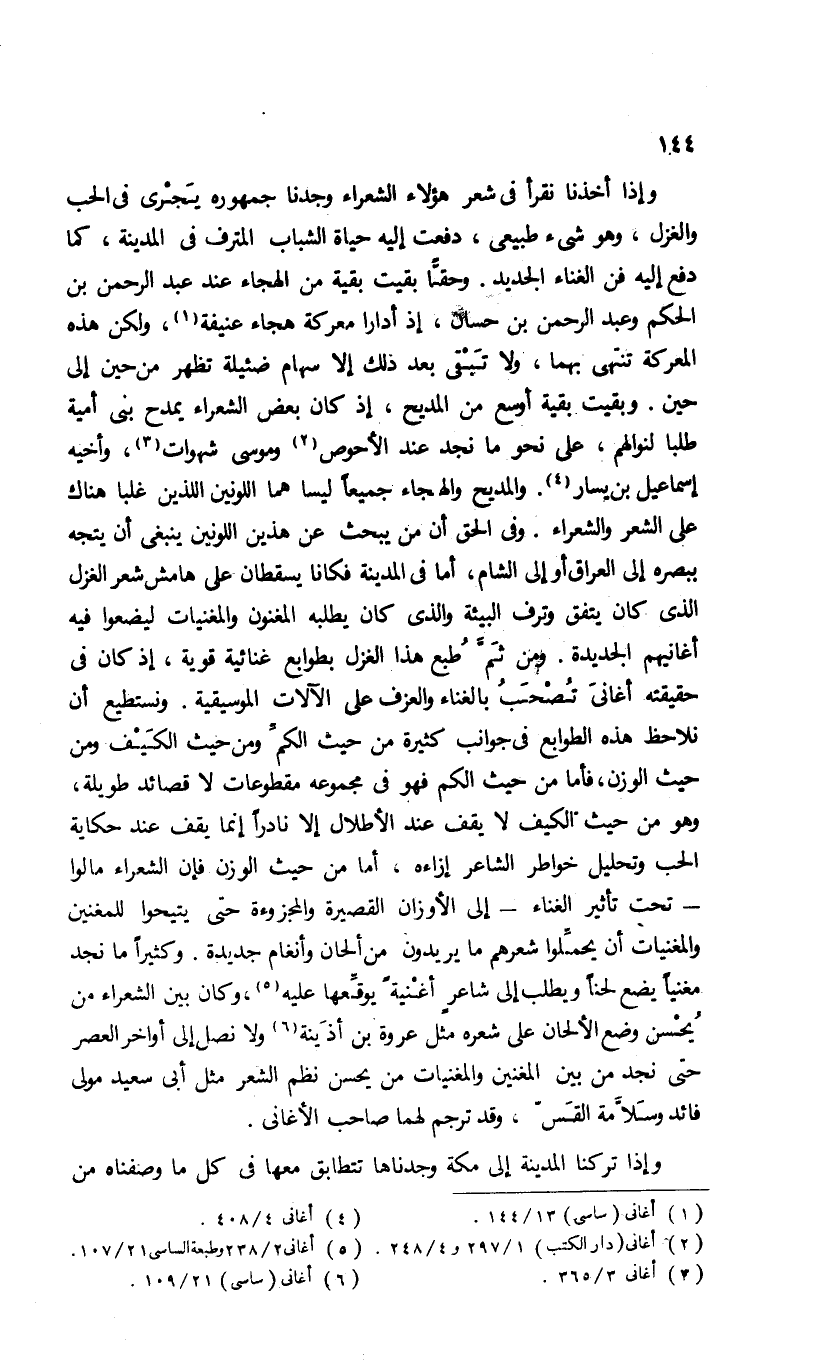 وإذا أخذنا نقرأ فى شعر هؤلاء الشعراء وجدنا جمهوره يجرى فى الحب والغزل، وهو شئ طبيعى، دفعت إليه حياة الشباب المترف فى المدينة، كما دفع إليه فن الغناء الجديد. وحقّا بقيت بقية من الهجاء عند عبد الرحمن بن الحكم وعبد الرحمن بن حسان، إذ أدارا معركة هجاء عنيفة (¬1)، ولكن هذه المعركة تنتهى بهما، ولا تبقى بعد ذلك إلا سهام ضئيلة تظهر من حين إلى حين. وبقيت بقية أوسع من المديح، إذ كان بعض الشعراء يمدح بنى أمية طلبا لنوالهم، على نحو ما نجد عند الأحوص (¬2) وموسى شهوات (¬3)، وأخيه إسماعيل بن يسار (¬4). والمديح والهجاء جميعا ليسا هما اللونين اللذين غلبا هناك على الشعر والشعراء. وفى الحق أن من يبحث عن هذين اللونين ينبغى أن يتجه ببصره إلى العراق أو إلى الشام، أما فى المدينة فكانا يسقطان على هامش شعر الغزل الذى كان يتفق وترف البيئة والذى كان يطلبه المغنون والمغنيات ليضعوا فيه أغانيهم الجديدة. ومن ثمّ طبع هذا الغزل بطوابع غنائية قوية، إذ كان فى حقيقته أغانى تصحب بالغناء والعزف على الآلات الموسيقية. ونستطيع أن نلاحظ هذه الطوابع فى جوانب كثيرة من حيث الكمّ ومن حيث الكيف ومن حيث الوزن، فأما من حيث الكم فهو فى مجموعه مقطوعات لا قصائد طويلة، وهو من حيث الكيف لا يقف عند الأطلال إلا نادرا إنما يقف عند حكاية الحب وتحليل خواطر الشاعر إزاءه، أما من حيث الوزن فإن الشعراء مالوا -تحت تأثير الغناء-إلى الأوزان القصيرة والمجزوءة حتى يتيحوا للمغنين والمغنيات أن يحمّلوا شعرهم ما يريدون من ألحان وأنغام جديدة. وكثيرا ما نجد مغنيا يضع لحنا ويطلب إلى شاعر أغنية يوقّعها عليه (¬5)، وكان بين الشعراء من يحسّن وضع الألحان على شعره مثل عروة بن أذينة (¬6) ولا نصل إلى أواخر العصر حتى نجد من بين المغنين والمغنيات من يحسن نظم الشعر مثل أبى سعيد مولى فائد وسلاّمة القسّ، وقد ترجم لهما صاحب الأغانى.