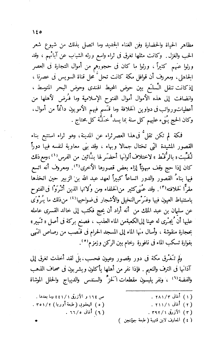 مظاهر الحياة والحضارة وفن الغناء الجديد وما اتصل بذلك من شيوع شعر الحب والغزل. وكانت مثلها تغرق فى ثراء واسع ورثه الشباب عن آبائهم، وقد ورثوا عنهم كثيرا، ورثوا ما كان فى حجورهم من أموال التجارة فى العصر الجاهلى، ومعروف أن قوافل مكة كانت تحل محل قناة السويس فى عصرنا، إذ كانت تنقل السّلع بين حوض المحيط الهندى وحوض البحر المتوسط، وانضافت إلى هذه الأموال أموال الفتوح الإسلامية وما فرض لأهلها من أعطيات ورواتب فى دواوين الخلافة وما قسم فيهم الأمويون دائما من أموال، وكان الحج يفئ عليهم كل سنة بما يسدّ خلّة كل محتاج.