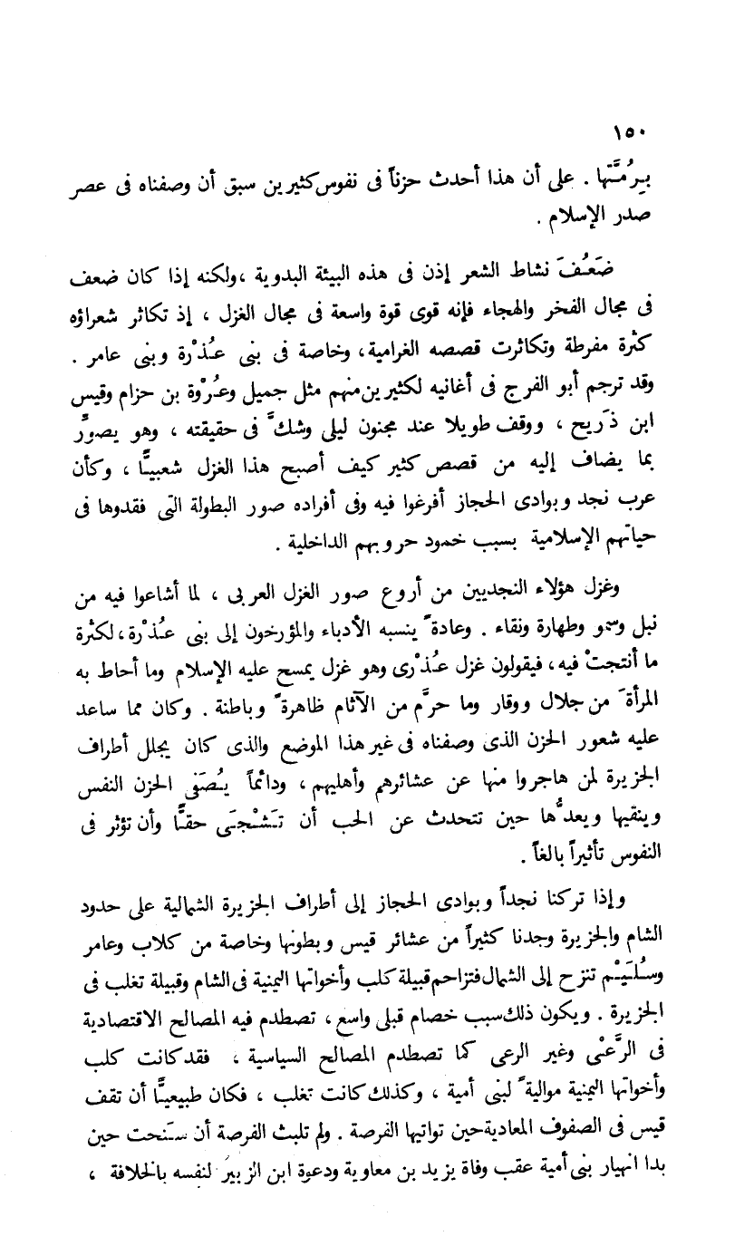 وغزل هؤلاء النجديين من أروع صور الغزل العربى، لما أشاعوا فيه من نبل وسمو وطهارة ونقاء. وعادة ينسبه الأدباء والمؤرخون إلى بنى عذرة، لكثرة ما أنتجت فيه، فيقولون غزل عذرى وهو غزل يمسح عليه الإسلام وما أحاط به المرأة من جلال ووقار وما حرّم من الآثام ظاهرة وباطنة. وكان مما ساعد عليه شعور الحزن الذى وصفناه فى غير هذا الموضع والذى كان يجلل أطراف الجزيرة لمن هاجروا منها عن عشائرهم وأهليهم، ودائما يصفى الحزن النفس وينقيها ويعدّها حين تتحدث عن الحب أن تشجى حقّا وأن تؤثر فى النفوس تأثيرا بالغا.