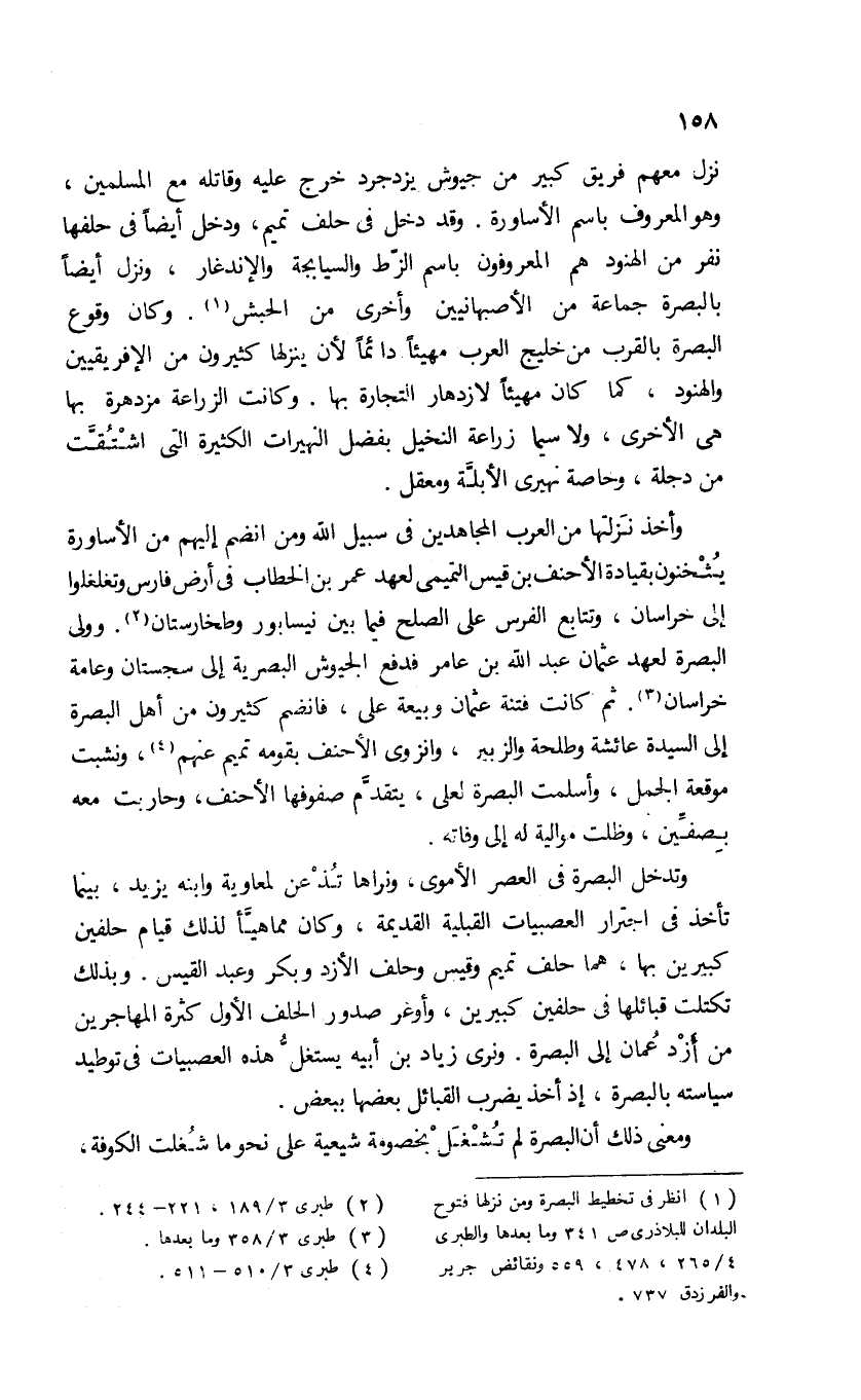 وأخذ نزلتها من العرب المجاهدين فى سبيل الله ومن انضم إليهم من الأساورة يثخنون بقيادة الأحنف بن قيس التميمى لعهد عمر بن الخطاب فى أرض فارس وتغلغلوا إلى خراسان، وتتابع الفرس على الصلح فيما بين نيسابور وطخارستان (¬2). وولى البصرة لعهد عثمان عبد الله بن عامر فدفع الجيوش البصرية إلى سجستان وعامة خراسان (¬3). ثم كانت فتنة عثمان وبيعة على، فانضم كثيرون من أهل البصرة إلى السيدة عائشة وطلحة والزبير، وانزوى الأحنف بقومه تميم عنهم (¬4)، ونشبت موقعة الجمل، وأسلمت البصرة لعلى، يتقدّم صفوفها الأحنف، وحاربت معه بصفّين، وظلت موالية له إلى وفاته.
