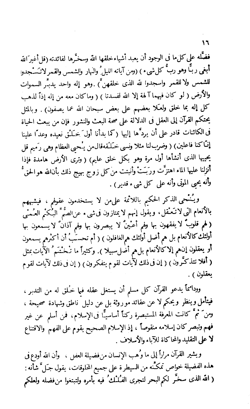 فضّله على كل ما فى الوجود أن يعبد أشياء خلقها الله وسخّرها لفائدته {(قُلْ أَغَيْرَ اللهِ أَبْغِي رَبًّا وَهُوَ رَبُّ كُلِّ شَيْءٍ)} {(وَمِنْ آياتِهِ اللَّيْلُ وَالنَّهارُ وَالشَّمْسُ وَالْقَمَرُ لا تَسْجُدُوا لِلشَّمْسِ وَلا لِلْقَمَرِ وَاُسْجُدُوا لِلّهِ الَّذِي خَلَقَهُنَّ).} وهو إله واحد يدبّر السموات والأرض {(لَوْ كانَ فِيهِما آلِهَةٌ إِلاَّ اللهُ لَفَسَدَتا)} {(وَما كانَ مَعَهُ مِنْ إِلهٍ إِذاً لَذَهَبَ كُلُّ إِلهٍ بِما خَلَقَ وَلَعَلا بَعْضُهُمْ عَلى بَعْضٍ سُبْحانَ اللهِ عَمّا يَصِفُونَ).} وبالمثل يحتكم القرآن إلى العقل فى الدلالة على صحة البعث والنشور فإن من يبعث الحياة فى الكائنات قادر على أن يردّها إليها {(كَما بَدَأْنا أَوَّلَ خَلْقٍ نُعِيدُهُ وَعْداً عَلَيْنا إِنّا كُنّا فاعِلِينَ)} {(وَضَرَبَ لَنا مَثَلاً وَنَسِيَ خَلْقَهُ قالَ مَنْ يُحْيِ الْعِظامَ وَهِيَ رَمِيمٌ قُلْ يُحْيِيهَا الَّذِي أَنْشَأَها أَوَّلَ مَرَّةٍ وَهُوَ بِكُلِّ خَلْقٍ عَلِيمٌ)} {(وَتَرَى الْأَرْضَ هامِدَةً فَإِذا أَنْزَلْنا عَلَيْهَا الْماءَ اِهْتَزَّتْ وَرَبَتْ وَأَنْبَتَتْ مِنْ كُلِّ زَوْجٍ بَهِيجٍ ذلِكَ بِأَنَّ اللهَ هُوَ الْحَقُّ وَأَنَّهُ يُحْيِ الْمَوْتى وَأَنَّهُ عَلى كُلِّ شَيْءٍ قَدِيرٌ).}