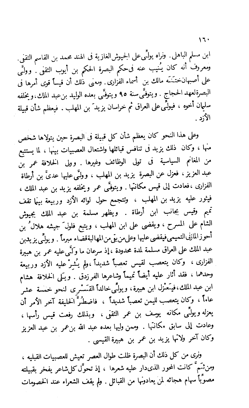 ونرى من كل ذلك أن البصرة ظلت طوال العصر تعيش للعصبيات القبلية، ومن ثمّ كانت المحور الذى دار عليه شعرها، إذ تحوّل كل شاعر يفخر بقبيلته مصوّبا سهام هجائه لمن يعادونها من القبائل. ولم يقف الشعراء عند الخصومات