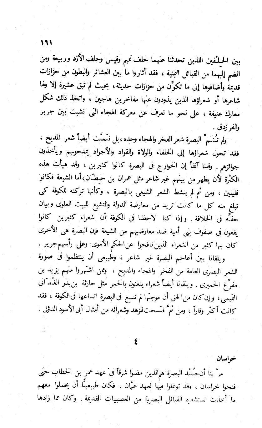 ويلقانا بين أعاجم البصرة غير شاعر، وطبيعى أن ينتظموا فى صورة الشعر البصرى العامة من الفخر والهجاء والمديح، وممن اشتهروا منهم يزيد بن مفرّغ الحميرى. ويلقانا أيضا شعراء يتغنون بالخمر مثل حارثة بن بدر الغدانى التميمى، وإن كان من الحق أن موجتها لم تتسع فى البصرة اتساعها فى الكوفة، فقد كانت أكثر وقارا، ومن ثمّ فسحت للزهد وشعرائه من أمثال أبى الأسود الدؤلى.