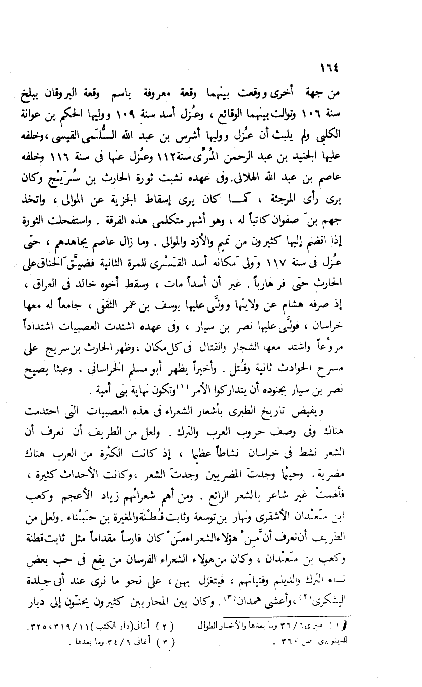 من جهة أخرى ووقعت بينهما وقعة معروفة باسم وقعة البروقان ببلخ سنة 106 وتوالت بينهما الوقائع، وعزل أسد سنة 109 ووليها الحكم بن عوانة الكلبى ولم يلبث أن عزل ووليها أشرس بن عبد الله السّلمى القيسى، وخلفه عليها الجنيد بن عبد الرحمن المرّى سنة 112 وعزل عنها فى سنة 116 وخلفه عاصم بن عبد الله الهلالى، وفى عهده نشبت ثورة الحارث بن سريج وكان يرى رأى المرجئة، كما كان يرى إسقاط الجزية عن الموالى، واتخذ جهم بن صفوان كاتبا له، وهو أشهر متكلمى هذه الفرقة. واستفحلت الثورة إذ انضم إليها كثيرون من تميم والأزد والموالى. وما زال عاصم يجاهدهم، حتى عزل فى سنة 117 وولى مكانه أسد القسرى للمرة الثانية فضيّق الخناق على الحارث حتى فر هاربا. غير أن أسدا مات، وسقط أخوه خالد فى العراق، إذ صرفه هشام عن ولايتها وولّى عليها يوسف بن عمر الثقفى، جامعا له معها خراسان، فولّى عليها نصر بن سيار، وفى عهده اشتدت العصبيات اشتدادا مروّعا واشتد معها الشجار والقتال فى كل مكان، وظهر الحارث بن سريج على مسرح الحوادث ثانية وقتل. وأخيرا يظهر أبو مسلم الخراسانى. وعبثا يصيح نصر بن سيار بجنوده أن يتداركوا الأمر (¬1) وتكون نهاية بنى أمية.