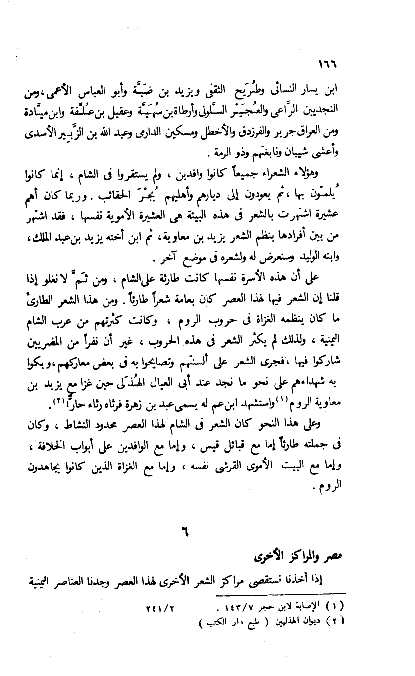 وعلى هذا النحو كان الشعر فى الشام لهذا العصر محدود النشاط، وكان فى جملته طارئا إما مع قبائل قيس، وإما مع الوافدين على أبواب الخلافة، وإما مع البيت الأموى القرشى نفسه، وإما مع الغزاة الذين كانوا يجاهدون الروم.