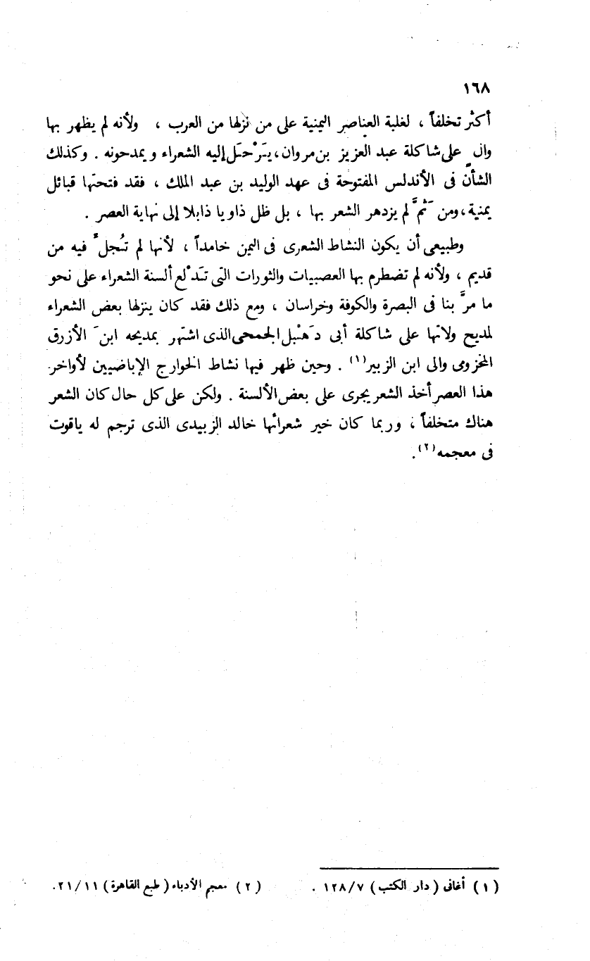 أكثر تخلفا، لغلبة العناصر اليمنية على من نزلها من العرب، ولأنه لم يظهر بها وال على شاكلة عبد العزيز بن مروان، يرحل إليه الشعراء ويمدحونه. وكذلك الشأن فى الأندلس المفتوحة فى عهد الوليد بن عبد الملك، فقد فتحتها قبائل يمنية، ومن ثمّ لم يزدهر الشعر بها، بل ظل ذاويا ذابلا إلى نهاية العصر.