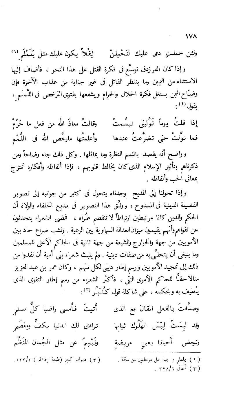 وواضح أنه يقصد باللمم النظرة وما يماثلها. وكل ذلك جاء وضاحا ومن ذكرناهم بتأثير الإسلام الذى كان يخالط قلوبهم، فإذا ألفاظه وأفكاره نمتزج بمعانى الحب وألفاظه.