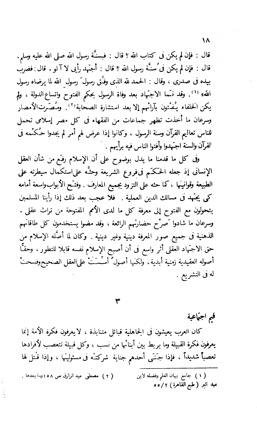 وفى كل ما قدمنا ما يدل بوضوح على أن الإسلام رفع من شأن العقل الإنسانى إذ جعله الحكم فى فروع الشريعة وحثّه على استكمال سيطرته على الطبيعة وقوانينها، كما حثه على التزود بجميع المعارف. وفتح الأبواب واسعة أمامه كى يجتهد فى مسالك الدين العملية. فلا عجب بعد ذلك إذا رأينا المسلمين يتحولون مع الفتوح إلى معرفة كل ما لدى الأمم المفتوحة من تراث عقلى، وسرعان ما شادوا صرح حضارتهم الرائعة، وقد مضوا يستخدمون كل طاقاتهم الذهنية فى جميع صور المعرفة دينية وغير دينية. وكان لما أصّله الإسلام من حق الاجتهاد العقلى أثر واسع فى أن أصبح الإسلام نفسه قابلا للتطور، وحقّا أصوله العقيدية زمنية أبدية، ولكنها أصول أسّست على العقل الصحيح وفسحت له فى التشريع.