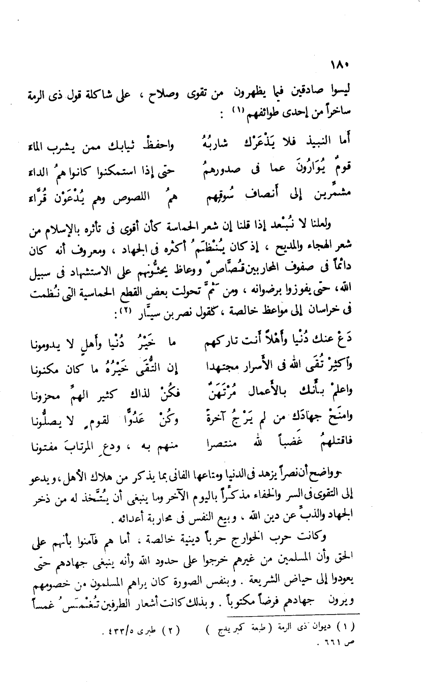 وكانت حرب الخوارج حربا دينية خالصة، أما هم فآمنوا بأنهم على الحق وأن المسلمين من غيرهم خرجوا على حدود الله وأنه ينبغى جهادهم حتى يعودوا إلى حياض الشريعة. وبنفس الصورة كان يراهم المسلمون من خصومهم ويرون جهادهم فرضا مكتوبا. وبذلك كانت أشعار الطرفين تغمس غمسا