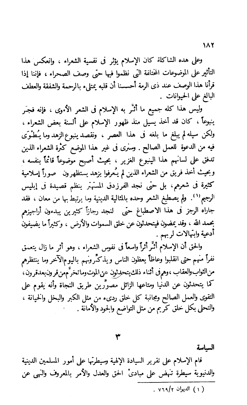 وعلى هذه الشاكلة كان الإسلام يؤثر فى نفسية الشعراء، وانعكس هذا التأثير على الموضوعات المختلفة التى نظموا فيها حتى وصف الصحراء، فإننا إذا قرأنا هذا الوصف عند ذى الرمة أحسسنا أن قلبه يمتلئ بالرحمة والشفقة والعطف البالغ على الحيوانات.