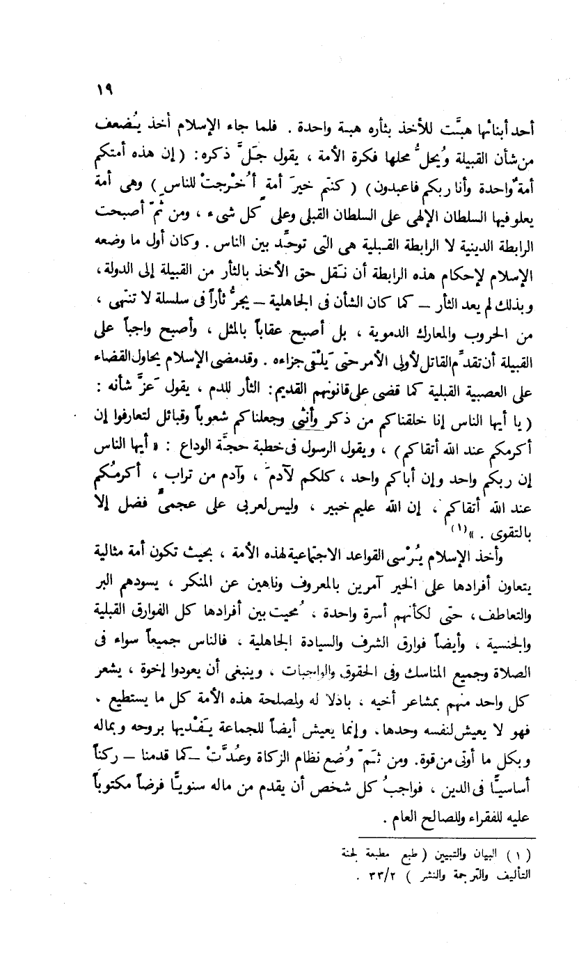 أحد أبنائها هبّت للأخذ بثأره هبة واحدة. فلما جاء الإسلام أخذ يضعف من شأن القبيلة ويحلّ محلها فكرة الأمة، يقول جلّ ذكره: {(إِنَّ هذِهِ أُمَّتُكُمْ أُمَّةً واحِدَةً وَأَنَا رَبُّكُمْ فَاعْبُدُونِ)} {(كُنْتُمْ خَيْرَ أُمَّةٍ أُخْرِجَتْ لِلنّاسِ)} وهى أمة يعلو فيها السلطان الإلهى على السلطان القبلى وعلى كل شئ، ومن ثمّ أصبحت الرابطة الدينية لا الرابطة القبلية هى التى توحّد بين الناس. وكان أول ما وضعه الإسلام لإحكام هذه الرابطة أن نقل حق الأخذ بالثأر من القبيلة إلى الدولة، وبذلك لم يعد الثأر-كما كان الشأن فى الجاهلية-يجرّ ثأرا فى سلسلة لا تنتهى، من الحروب والمعارك الدموية، بل أصبح عقابا بالمثل، وأصبح واجبا على القبيلة أن تقدّم القاتل لأولى الأمر حتى يلقى جزاءه. وقد مضى الإسلام يحاول القضاء على العصبية القبلية كما قضى على قانونهم القديم: الثأر للدم، يقول عزّ شأنه: