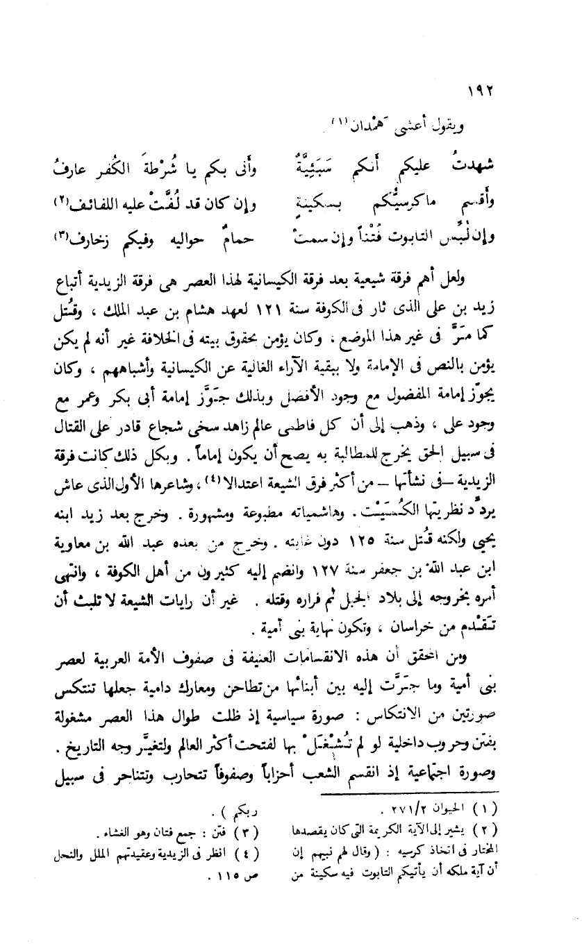ولعل أهم فرقة شيعية بعد فرقة الكيسانية لهذا العصر هى فرقة الزيدية أتباع زيد بن على الذى ثار فى الكوفة سنة 121 لعهد هشام بن عبد الملك، وقتل كما مرّ فى غير هذا الموضع، وكان يؤمن بحقوق بيته فى الخلافة غير أنه لم يكن يؤمن بالنص فى الإمامة ولا ببقية الآراء الغالية عن الكيسانية وأشباههم، وكان يجوّز إمامة المفضول مع وجود الأفضل وبذلك جوّز إمامة أبى بكر وعمر مع وجود على، وذهب إلى أن كل فاطمى عالم زاهد سخى شجاع قادر على القتال فى سبيل الحق يخرج للمطالبة به يصح أن يكون إماما. وبكل ذلك كانت فرقة الزيدية-فى نشأتها-من أكثر فرق الشيعة اعتدالا (¬4)، وشاعرها الأول الذى عاش يردّد نظريتها الكميت، وهاشمياته مطبوعة ومشهوره. وخرج بعد زيد ابنه يحيى ولكنه قتل سنة 125 دون غايته. وخرج من بعده عبد الله بن معاوية ابن عبد الله بن جعفر سنة 127 وانضم إليه كثيرون من أهل الكوفة، وانتهى أمره بخروجه إلى بلاد الجبل ثم فراره وقتله. غير أن رايات الشيعة لا تلبث أن تقدم من خراسان، وتكون نهاية بنى أمية.
