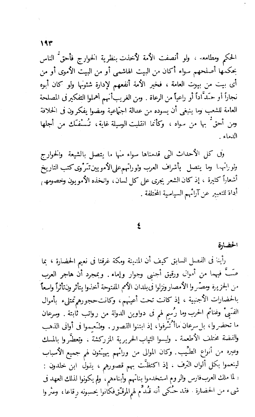 الحكم ومطامعه، ولو أنصفت الأمة لأخذت بنظرية الخوارج فأحقّ الناس بحكمها أصلحهم سواء أكان من البيت الهاشمى أو من البيت الأموى أو من أى بيت من بيوت العامة، فخير الأمة أنفعهم لإدارة شئونها ولو كان أبوه نجارا أو حدّادا أو راعيا من الرعاة. ومن الغريب أنهم أهملوا التفكير فى المصلحة العامة للشعب وما ينبغى أن يسوده من عدالة اجتماعية ومضوا يفكرون فى الخلافة ومن أحقّ بها من سواه، وكأنما انقلبت الوسيلة غاية، تسفك من أجلها الدماء.